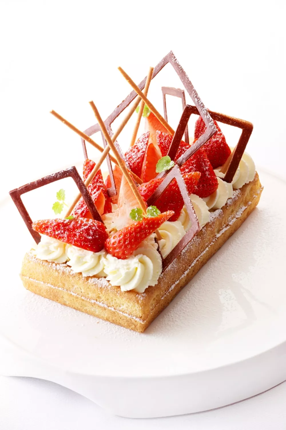 Spuit de slagroom op de wafel en versier met aardbeien, de koekjesstokjes en chocoladevormpjes.
