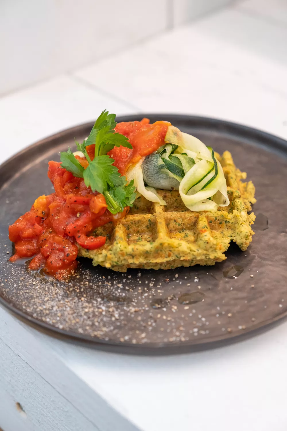 Schik een wafeltje mooi op een bord. Leg er wat courgettesliertjes bovenop. Werk af met het tomatensausje en een takje peterselie.