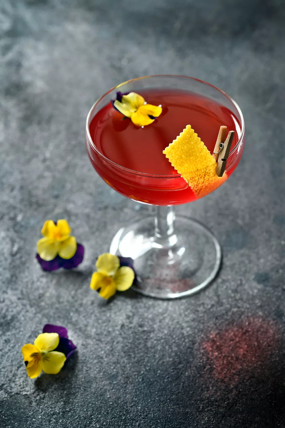 Zeef de cocktail in een cocktailcoupette en garneer met een zeste van sinaasappel.