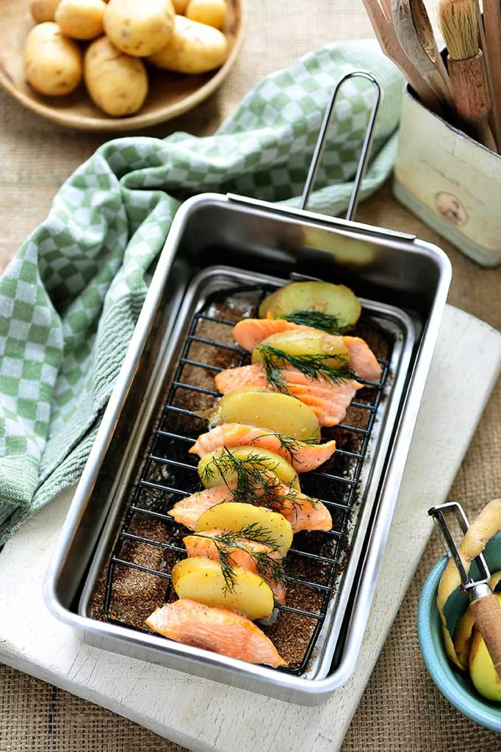 Leg er afwisselend een plak aardappel en een plakje zalm op. Leg op elk stukje zalm een takje dille. Sluit de rookdoos en zet ze op een hevig vuur (gasvuur, paraffinepotje of barbecue). Verminder het vuur zodra er rookontwikkeling is en laat nog ongeveer 5 minuten verder warmen/roken.