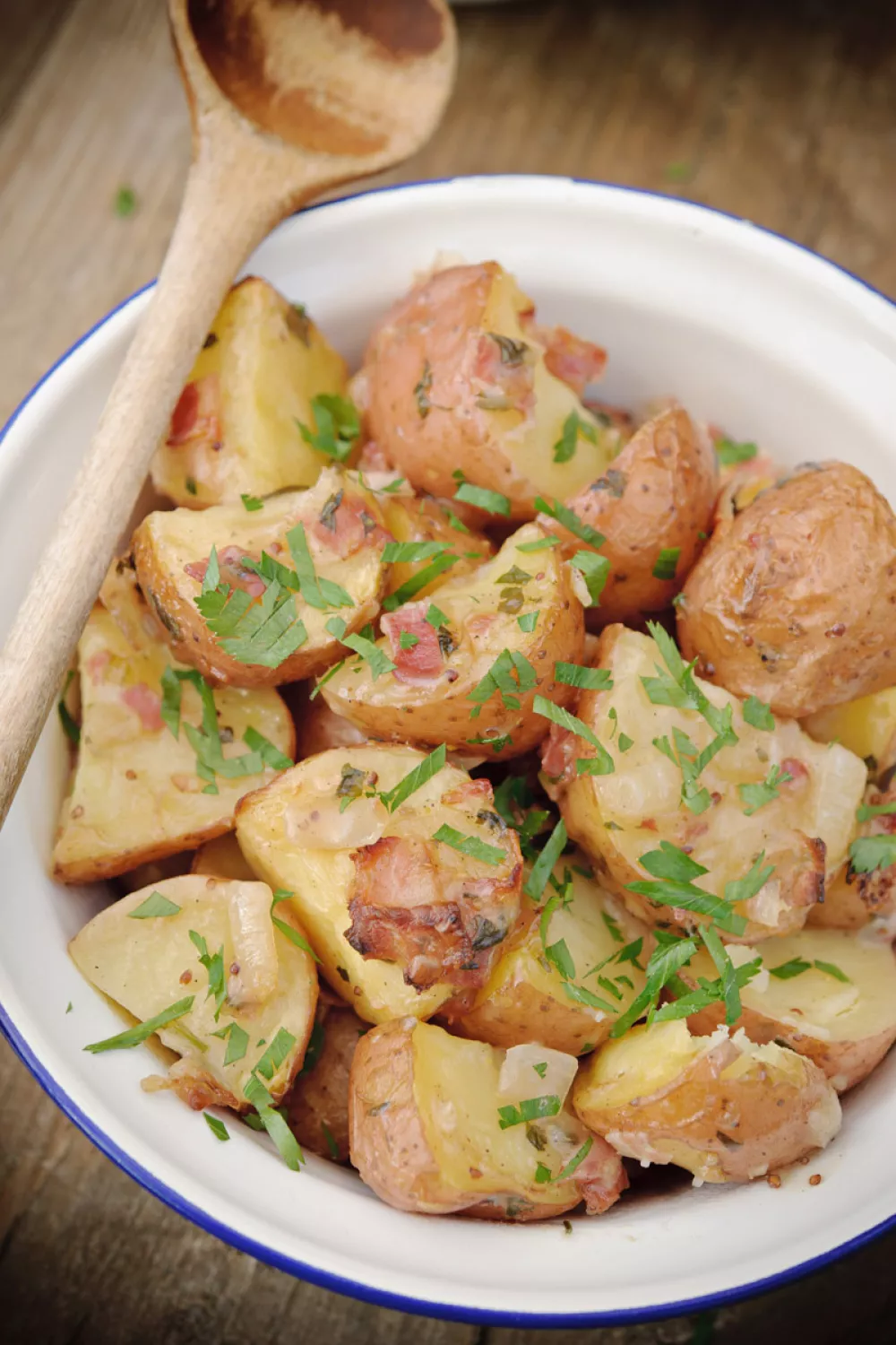 Deze warme aardappelsalade uit de oven combineert goudbruine Roseval-aardappelen met krokant ontbijtspek, gesmoorde ui en een romige mosterd-azijnsaus op basis van bloem. Door de aardappelen kort voor te koken en vervolgens te roosteren ontstaat een knapperige buitenkant en smeuïge binnenkant, afgewerkt met selderijzout en peterselie. Heerlijk als stevig bijgerecht bij biefstuk of op een gezellige herfst- of wintertafel.