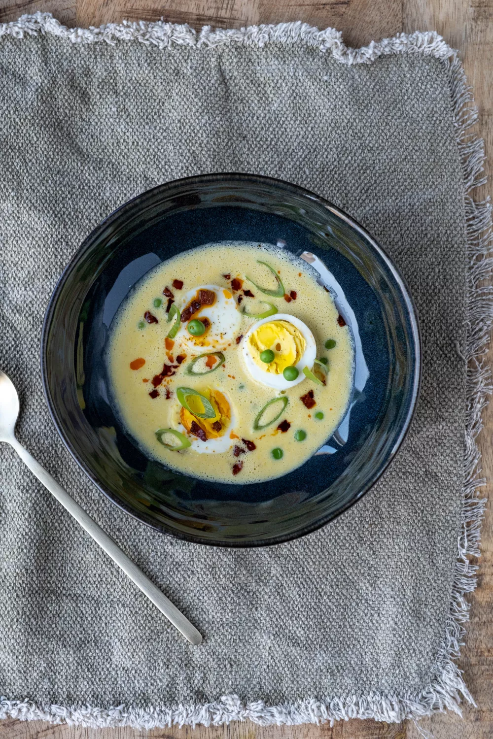 Schik de schijfjes ei in een bordje. Schenk er de soep over en werk deze nog af met erwtjes, lente-ui, chorizo en wat olie van de chorizo.