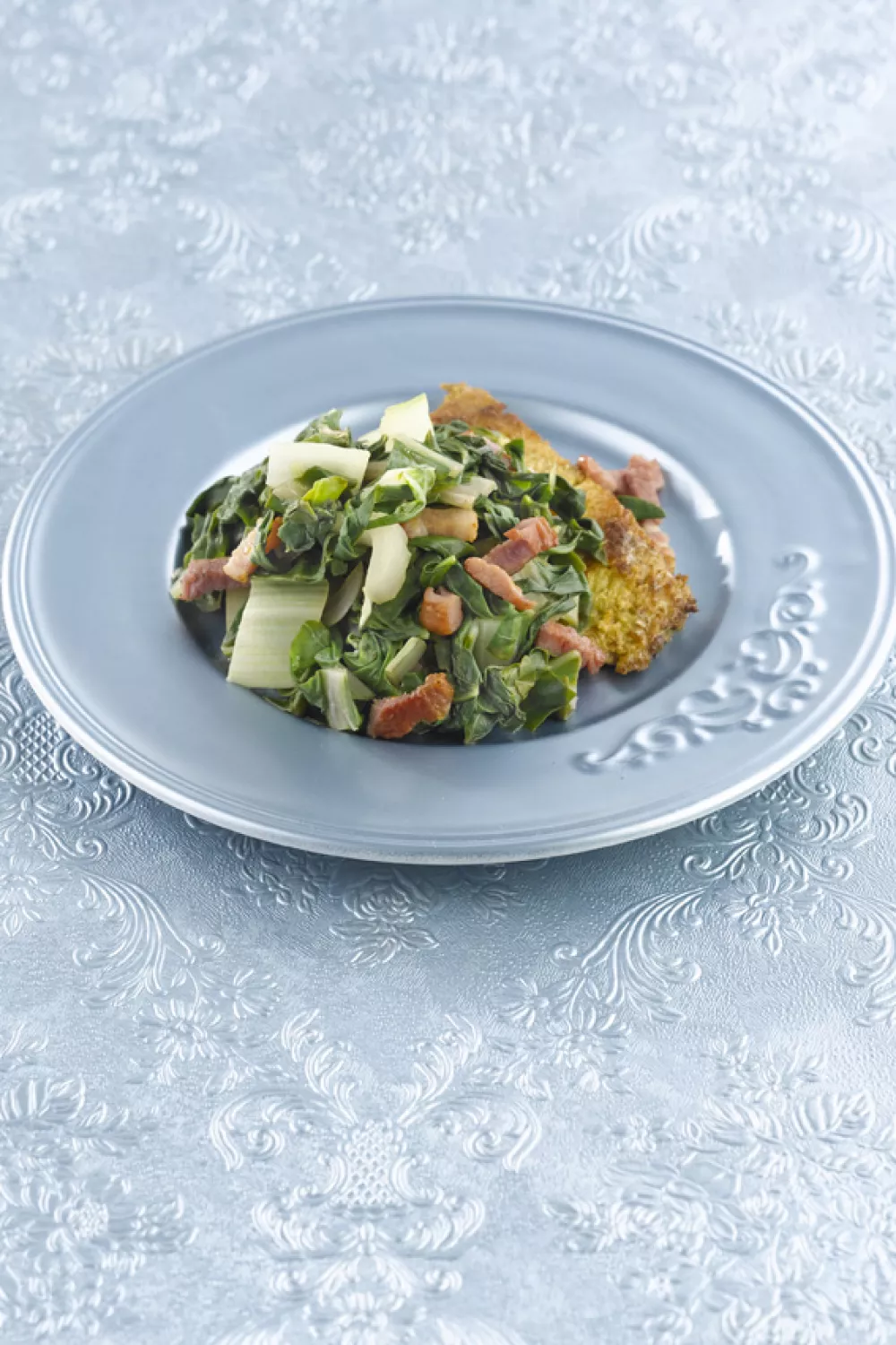 Warmoes met gerookt spek is een rustiek en troostrijk bijgerecht met een diepe rooksmaak en een frisse citroennoot. De stevige snijbiet wordt kort gesauteerd en daarna mee gestoofd met goudbruin gebakken spek en ui, licht gebonden met bloem voor een smeuïge saus. Heerlijk als winterse groenteschotel bij aardappelpuree of als smaakvolle aanvulling bij een simpel avondmaal.