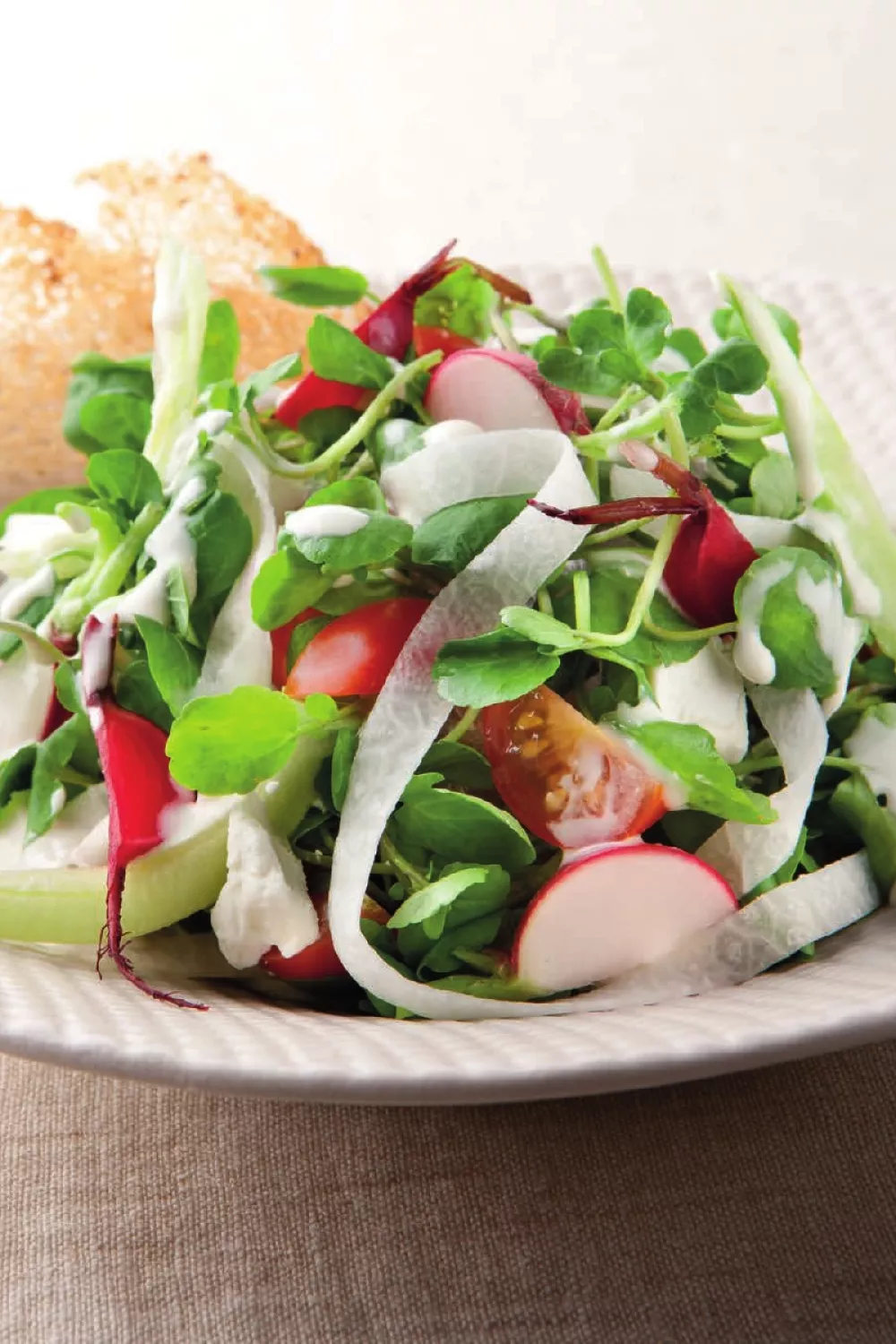 Was de waterkers zorgvuldig en sla voorzichtig droog. Meng er wat vinaigrette en zwarte peper door. Meng de salade met de in vier gesneden radijzen, in slierten gesneden daikon, de blokjes fetakaas en in vier gesneden kerstomaatjes.