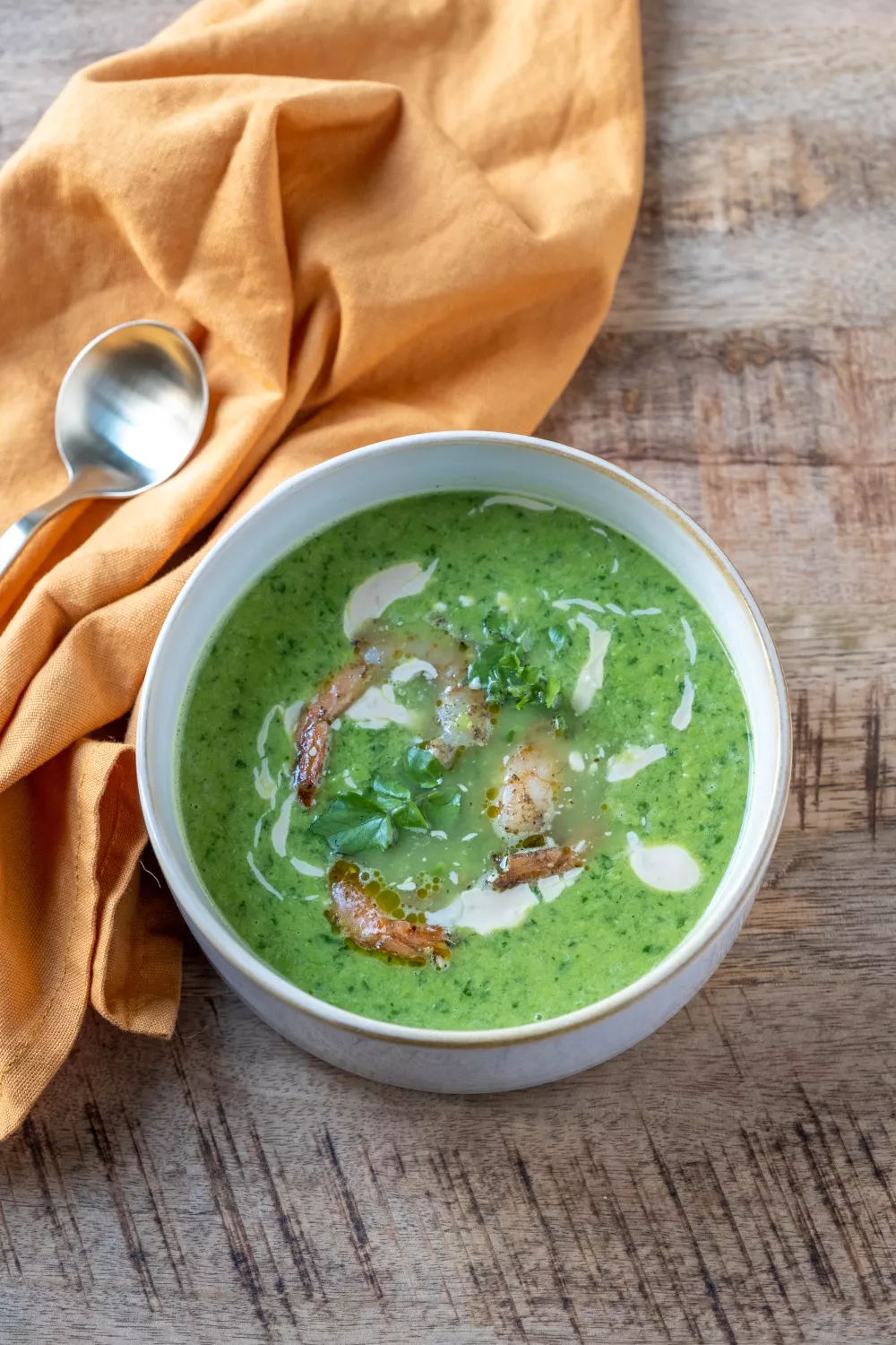 Romige waterkerssoep met doperwten, tahin en krokant gebakken scampi is een frisse lente starter vol Midden Oosterse smaakaccenten. De soep maak je snel door ui, knoflook en komijn te fruiten, bouillon en groenten te laten garen en alles glad te pureren. Een citroen tahin dressing en za'atar op de scampi geven diepte en een knapperige bite. Perfect als lichte lunch of sfeervol voorgerecht.