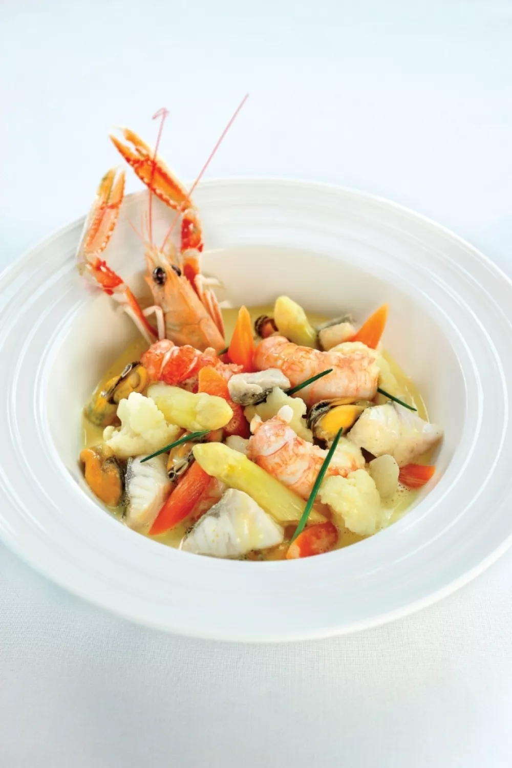 Verdeel de vissen en groenten over voorverwarmde borden en werk af met een langoustinekop.
