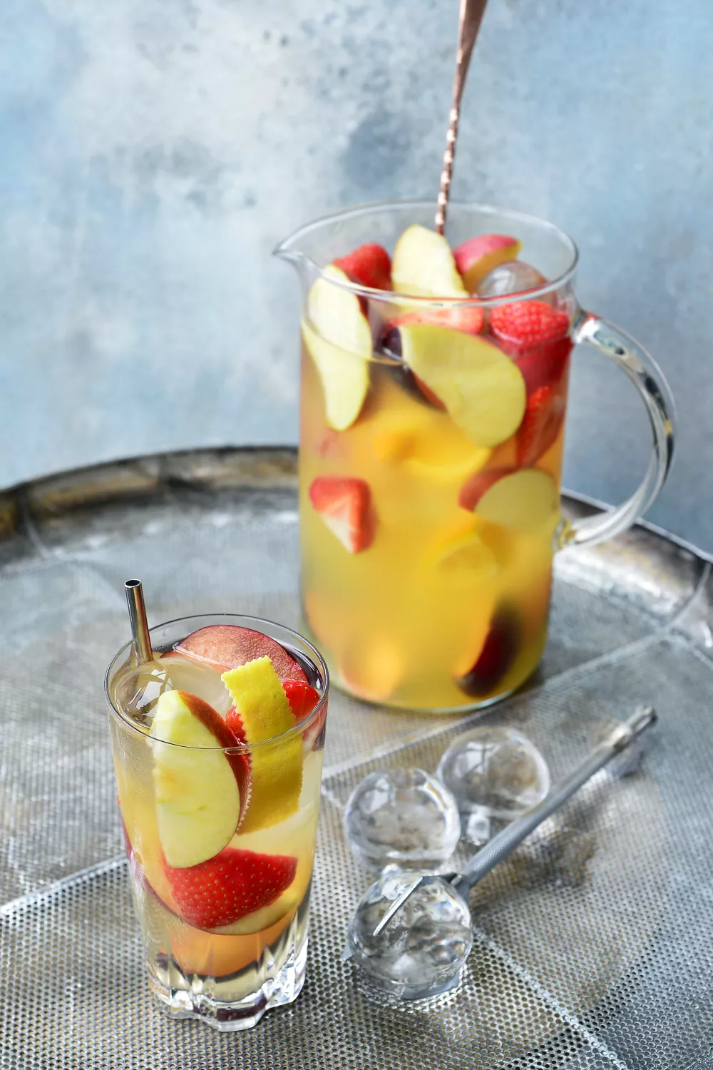 Vul een karaf met alle vloeibare ingrediënten. Snij het fruit in kleine stukjes en voeg deze ook toe aan de karaf. Schenk het drankje in een Collins- of longdrink-glas met ijsblokjes en schep enkele stukken fruit uit de karaf in het glas.