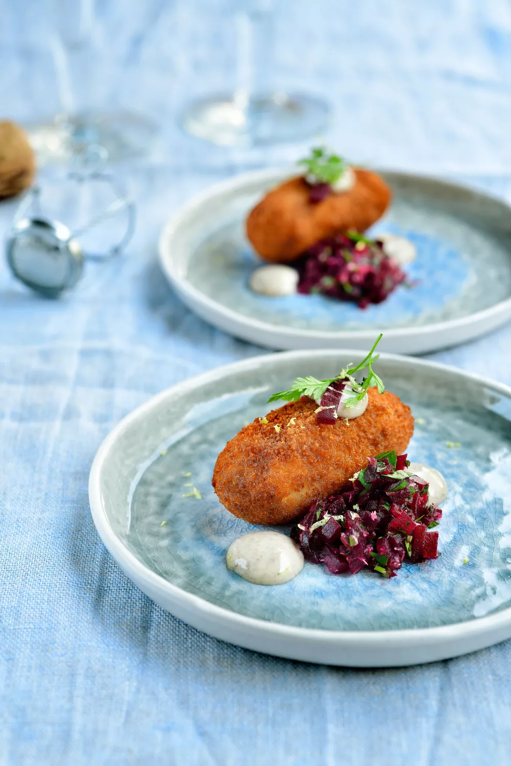Serveer de wildkroketten met de truffelmayo en de tartaar van rode biet. Werk af met zeste van citroen en enkele blaadjes kervel.
