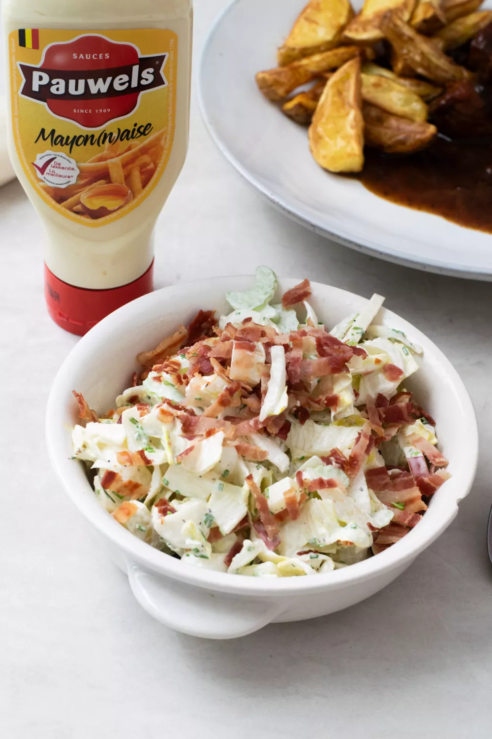 Deze knapperige witloofsalade combineert bitter witloof met zoete appel, frisse selder en krokant gerookt spek voor een speelse textuurmix. Romige Pauwels mayonaise en dragonazijn met bieslook geven een verfijnde, lichtzure dressing, perfect als bijgerecht of lichte lunch in herfst en winter. Het spek wordt snel krokant gemaakt in de microgolfoven, zodat je in een handomdraai een smaakvol gerecht op tafel hebt.
