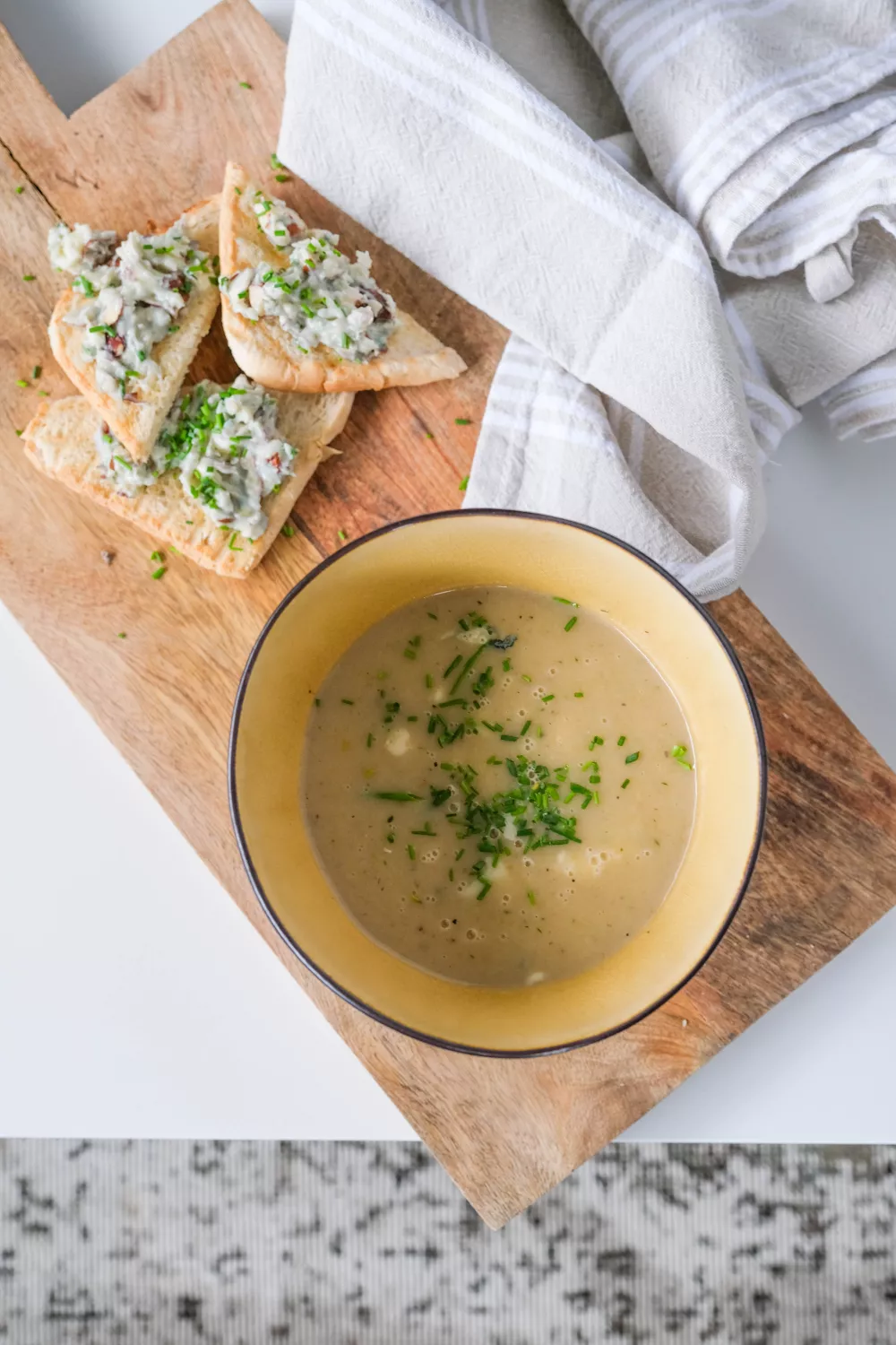 Romige witloofsoep met hartige blauwe kaas toastjes combineert de licht bittere smaak van witloof met volle room en krokante amandelen tot een rijk, troostend gerecht. Het witloof wordt zacht gestoofd met aardappel en kruiden, gepureerd met de staafmixer en afgewerkt met bieslook, terwijl geroosterd brood belegd met blauwe kaas en fijngehakte amandelen voor textuur zorgt. Perfect als verwarmend herfst en wintergerecht of als elegant voorgerecht bij een gezellig diner.