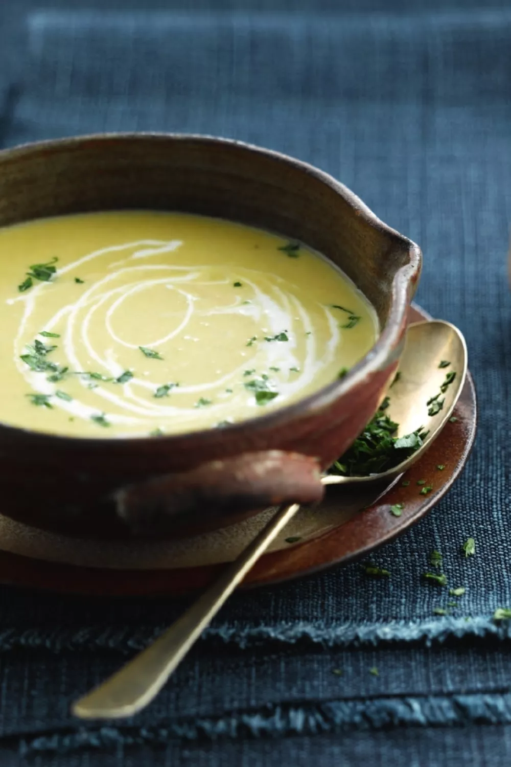 Mix de soep glad en breng op smaak met sake, peper en zout. Strooi er gehakte peterselie over net voor het serveren.