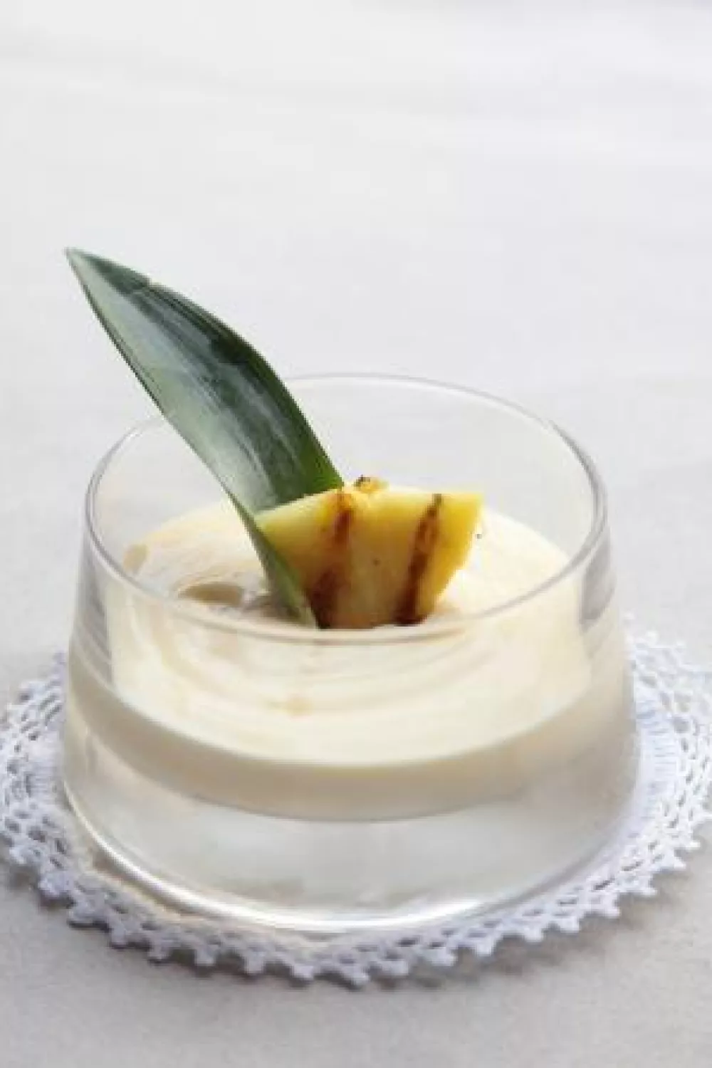 Romige witte chocoladecrème met een fris tropisch accent: in de pan gegrilde ananas. Melk en room met vanille worden verwarmd en over chocolade gegoten, gelatine geeft een zijdezachte structuur. De half opgeklopte room wordt er luchtig door gespateld en het geheel zet in glaasjes. Perfect als zomers dessert of feestelijk nagerecht na een etentje.