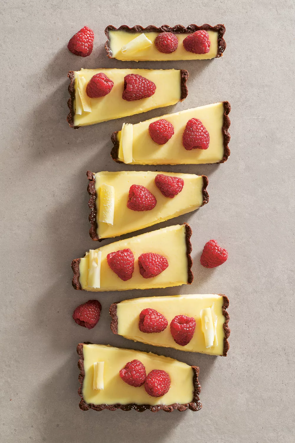 Laat de taartbodem volledig afkoelen, haal hem uit het blik en vul hem met de custard. Versier de taart met verse frambozen en de witte-chocoladekrullen.