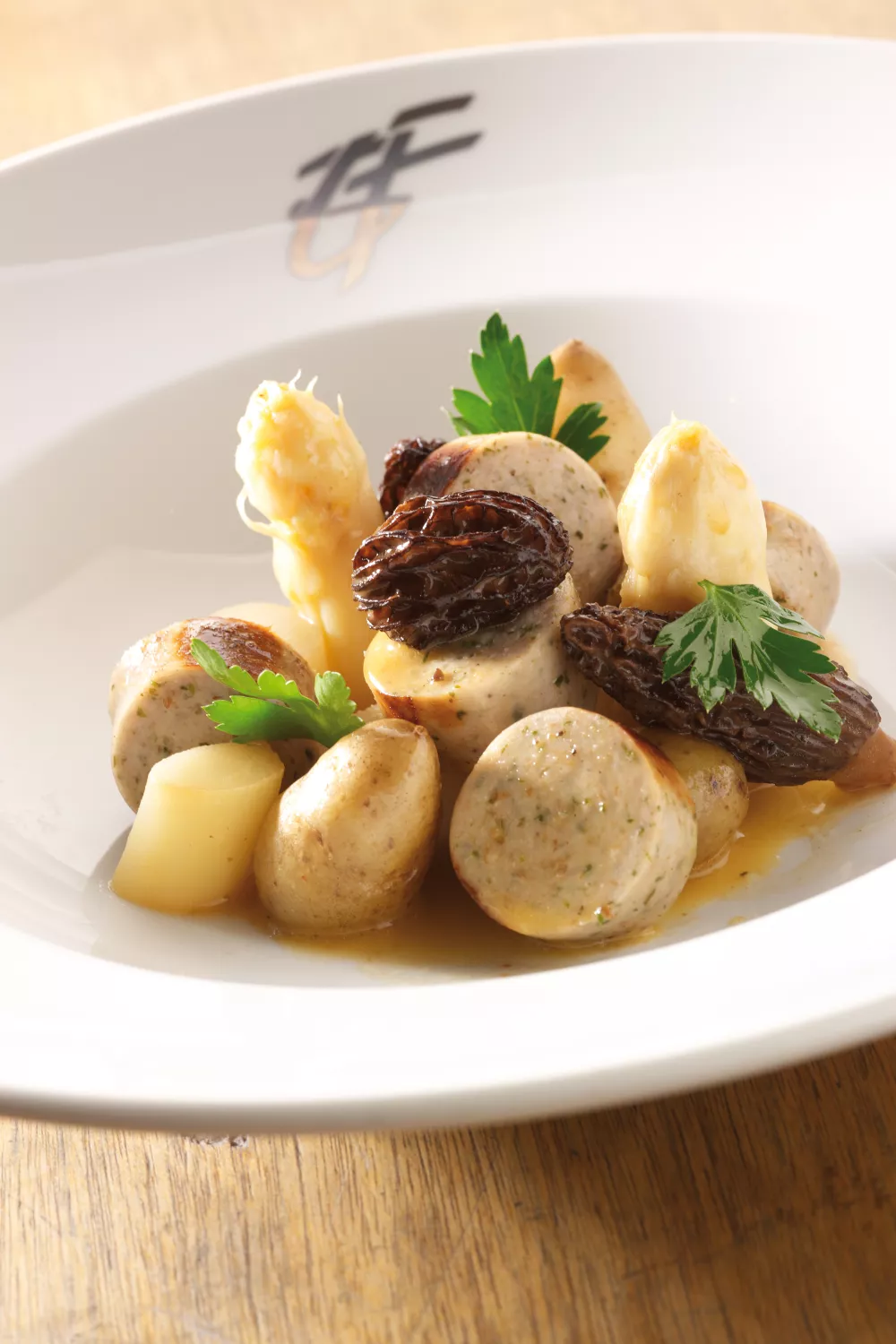 Een hartig voorjaarsgerecht met witte pensen, boterige primeuraardappelen, zachte witte asperges en aromatische morieltjes in een rijke botersaus met kippenbouillon. De pens wordt goudbruin en krokant gebakken, de gedroogde morieltjes worden eerst geweekt en vervolgens zachtjes verwarmd met de asperges. Ideaal als feestelijk hoofdgerecht voor lente of paas.