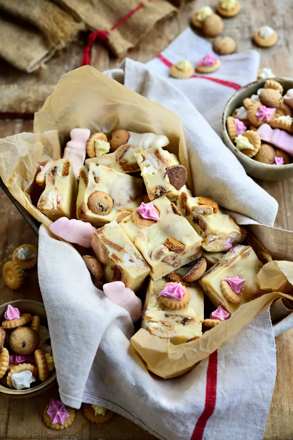 Smelt de witte chocolade au bain-marie. Haal van het vuur als deze gesmolten is en doe de gecondenseerde melk erbij (belangrijk dat het volle gecondenseerde melk is). Meng goed en voeg het snoepgoed toe. Breek de grotere koekjes en snoepjes in stukjes.