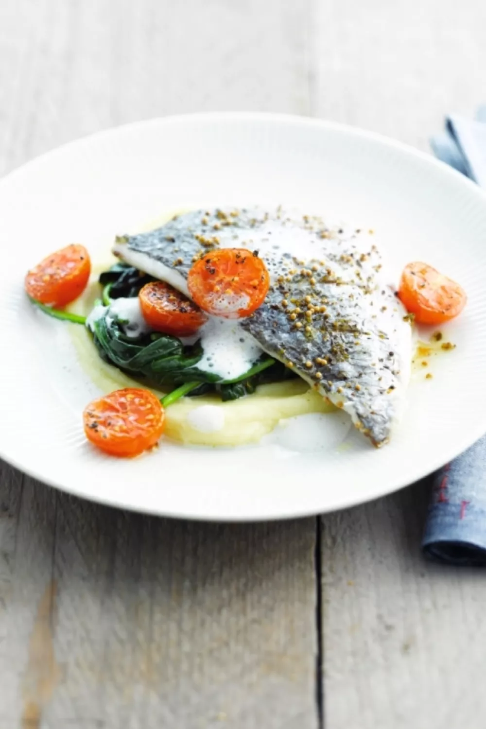 Een lichte mediterrane witvisschotel met romige aardappelpuree, geslonken spinazie en zoete kerstomaatjes. De vis wordt kort gegratineerd onder de grill en krijgt extra diepte door een scheut pastis, afgewerkt met luchtig basilicumschuim op warme melk. Perfect als zomers diner of verfijnde doordeweekse maaltijd die snel klaar is.