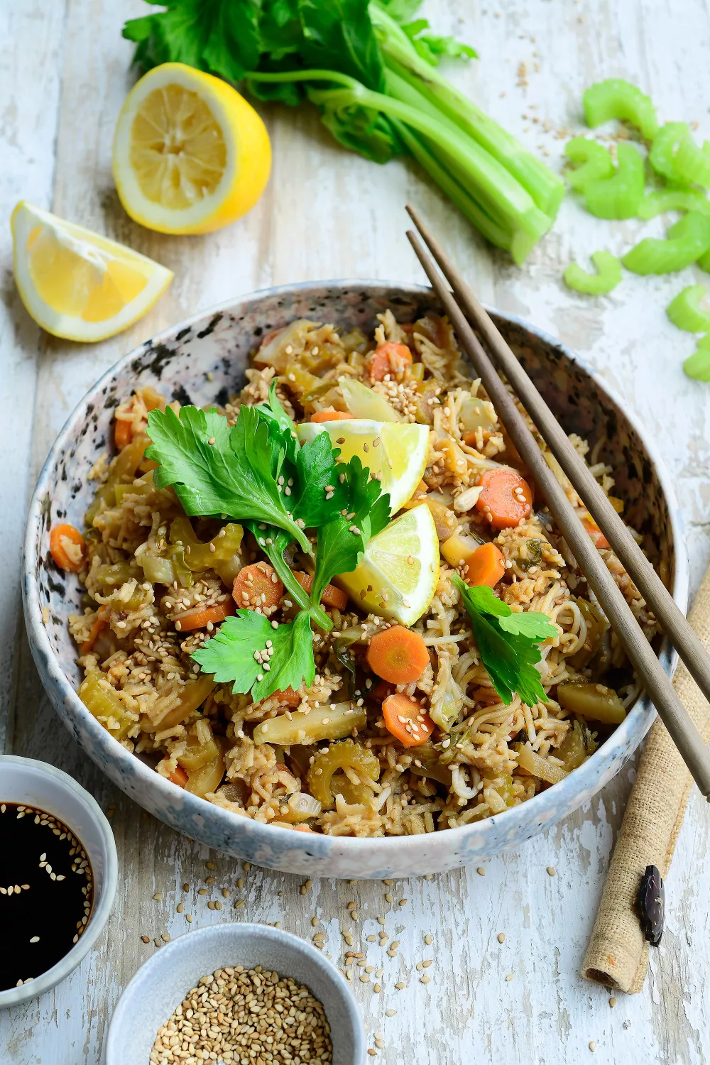 Deze snelle wok met noedels en krokant gebakken bloemkoolbladeren brengt Aziatische smaken samen met frisse citroen en nootachtige sesamzaadjes. Wortel, selder en een pittige combinatie van knoflook en gember geven pit aan dit vegetarische eenpansgerecht, perfect voor doordeweekse maaltijden of lichte zomeravonden. Ideaal om restjes te verwerken en in enkele minuten te bereiden door alles kort te wokken en af te maken met sojasaus.