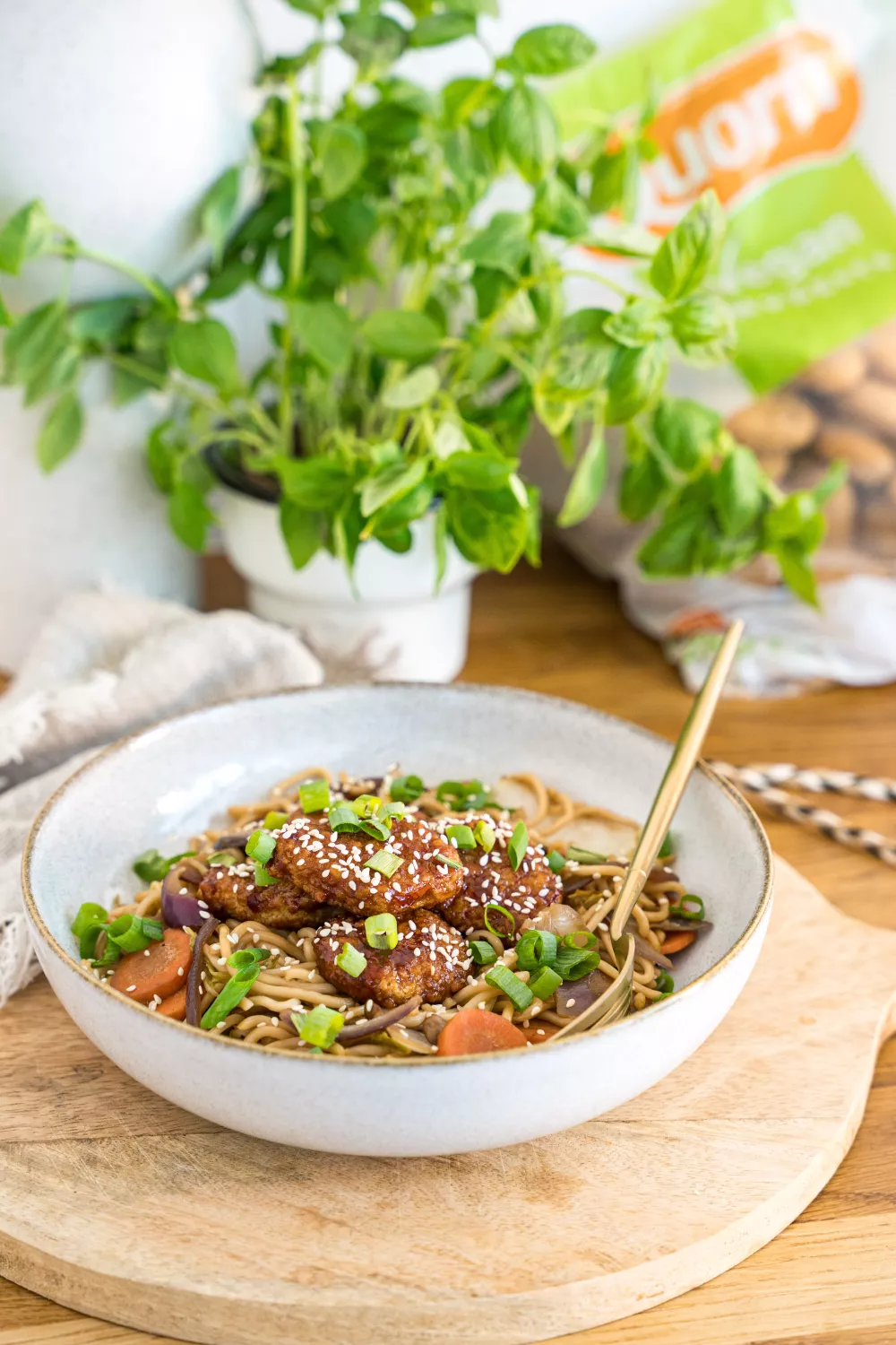 Knapperige Quorn nuggets met een zoetzure sticky saus, geserveerd op zachte udonnoedels en snel geroerbakte wokgroenten. De nuggets gaan in de oven terwijl je groenten en noedels in de wok klaarmaakt en de saus in een pan inkookt tot hij mooi plakt en vol umami zit. Een snelle, troostrijke vegetarische wokmaaltijd voor doordeweekse avonden of gezellige herfst- en winterdiners, afgewerkt met lente-ui en geroosterde sesam.