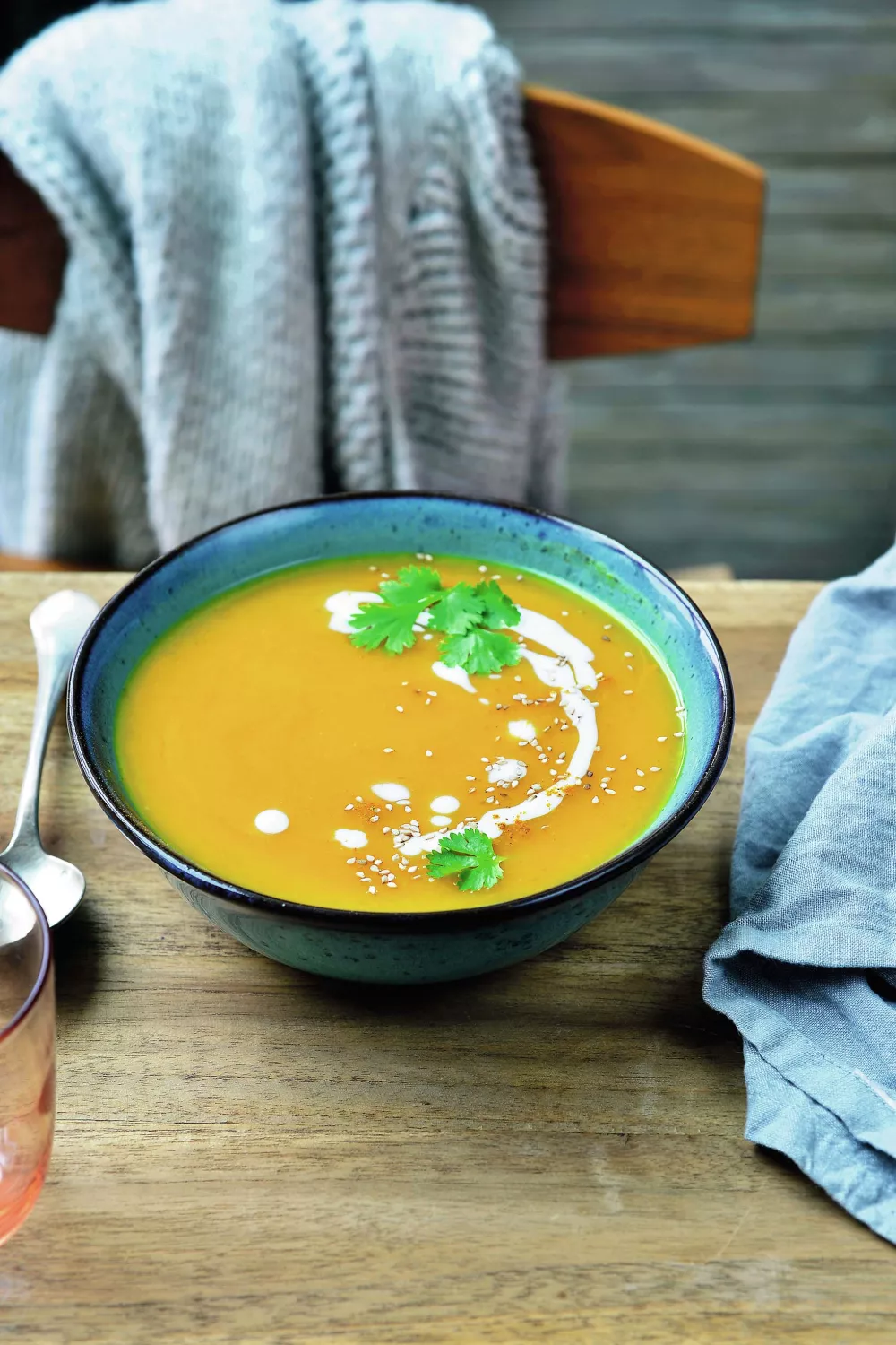 Voeg peper en zout naar smaak toe. Schep uit en werk af met verse koriander, sesamzaadjes en kokosroom.