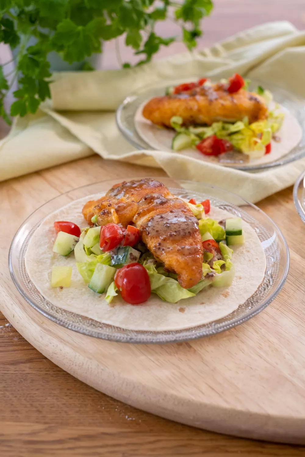 Neem enkele tortillavellen en beleg ze met fijngesnipperde ijsbergsla, een stuk krokant gebakken kip, komkommer, tomaat. Werk af met de honingmosterddressing.