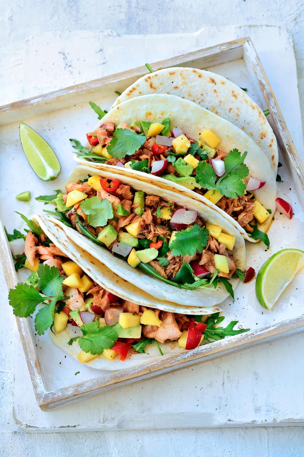 Frisse wraps met pulled zalm en pittige mangosalsa, perfect als zomerse lunch of smaakvol hoofdgerecht voor een informeel etentje. De zalm wordt in de oven gegaard in een marinade van honing, limoensap en zoete sojasaus en daarna met een vork uit elkaar getrokken, terwijl mango, avocado, radijs en chili zorgen voor fruitig en knapperig contrast. Vouw alles in warme tortillawraps met rucola en verse koriander en serveer met een limoenpartje voor extra frisheid.