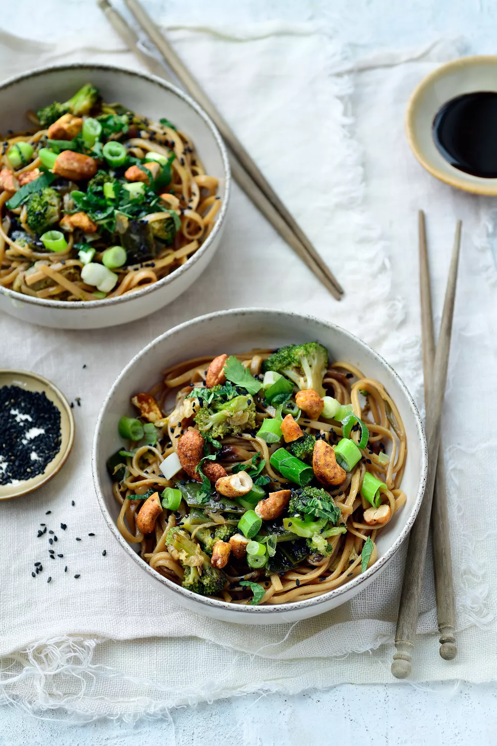 Verdeel de noedels, saus en groenten over de kommetjes. Werk af met de lente-ui, munt, koriander, sesam en grofgehakte cashewnoten.