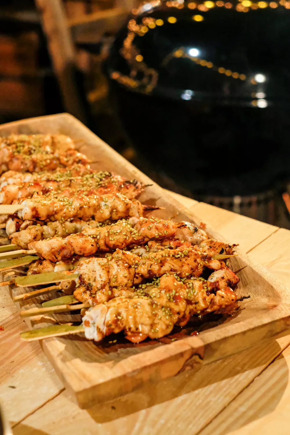 Malse yakitori van kip met een zoetzoute honing en soja glazuur en een kruidige cajun twist, ideaal voor liefhebbers van zoet en pittig. De kipblokjes worden aan stokjes geregen, gegrild op de barbecue en tijdens het bakken rijkelijk geborsteld met een gekaramelliseerde saus van sjalot, gember, knoflook, honing en sojasaus. Serveer als zomers borrelhapje of als smaakvol hoofdgerecht bij een informele barbecue of doordeweekse maaltijd, afgewerkt met wasabi sesamzaadjes voor een knapperige bite.