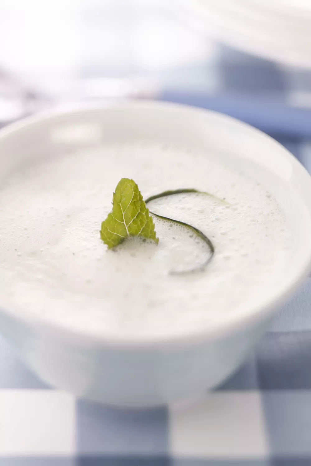 Serveer koel met enkele reepjes komkommer en muntblaadjes.