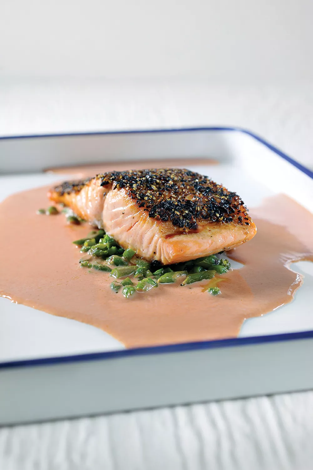Zalm met een knapperige kruidenkorst, geserveerd bij frisse tuinboontjes en een romige tomatenboter, is een licht en feestelijk visgerecht voor lente en zomer. De mix van vijf pepers, komijn, karwij en venkel geeft diepe aroma's terwijl de tomatensaus wordt ingekookt en gemonteerd met koude boter voor een fluweelzachte afwerking. Korte technieken zoals kruiden malen, zalm bakken en bonen blancheren maken dit gerecht geschikt voor zowel een doordeweeks diner als een bijzonder etentje.