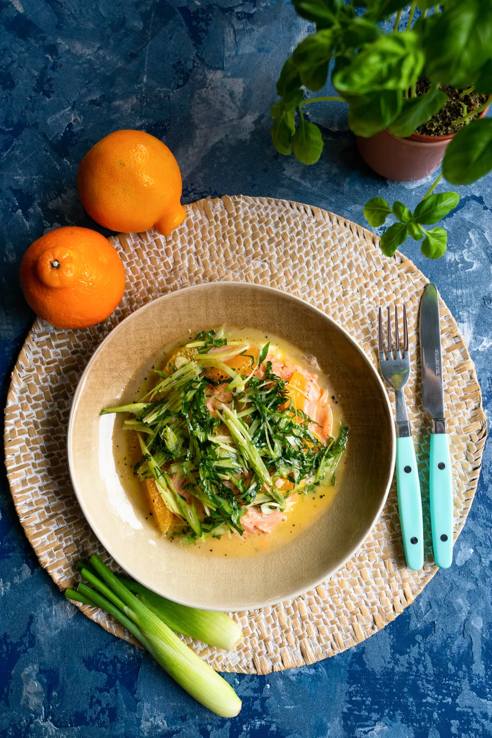 Een fris en feestelijk voorgerecht met zalm en knapperige venkel, geserveerd bij romige burrata en een glanzende witte wijnsaus met boter. Dunne plakjes zalm met partjes sinaasappel geven frisse citrus, terwijl de saus wordt ingekookt en een kort moment in de oven de smaken samensmelt. Ideaal als mediterraan licht gerecht voor zomerlunch of elegant diner.