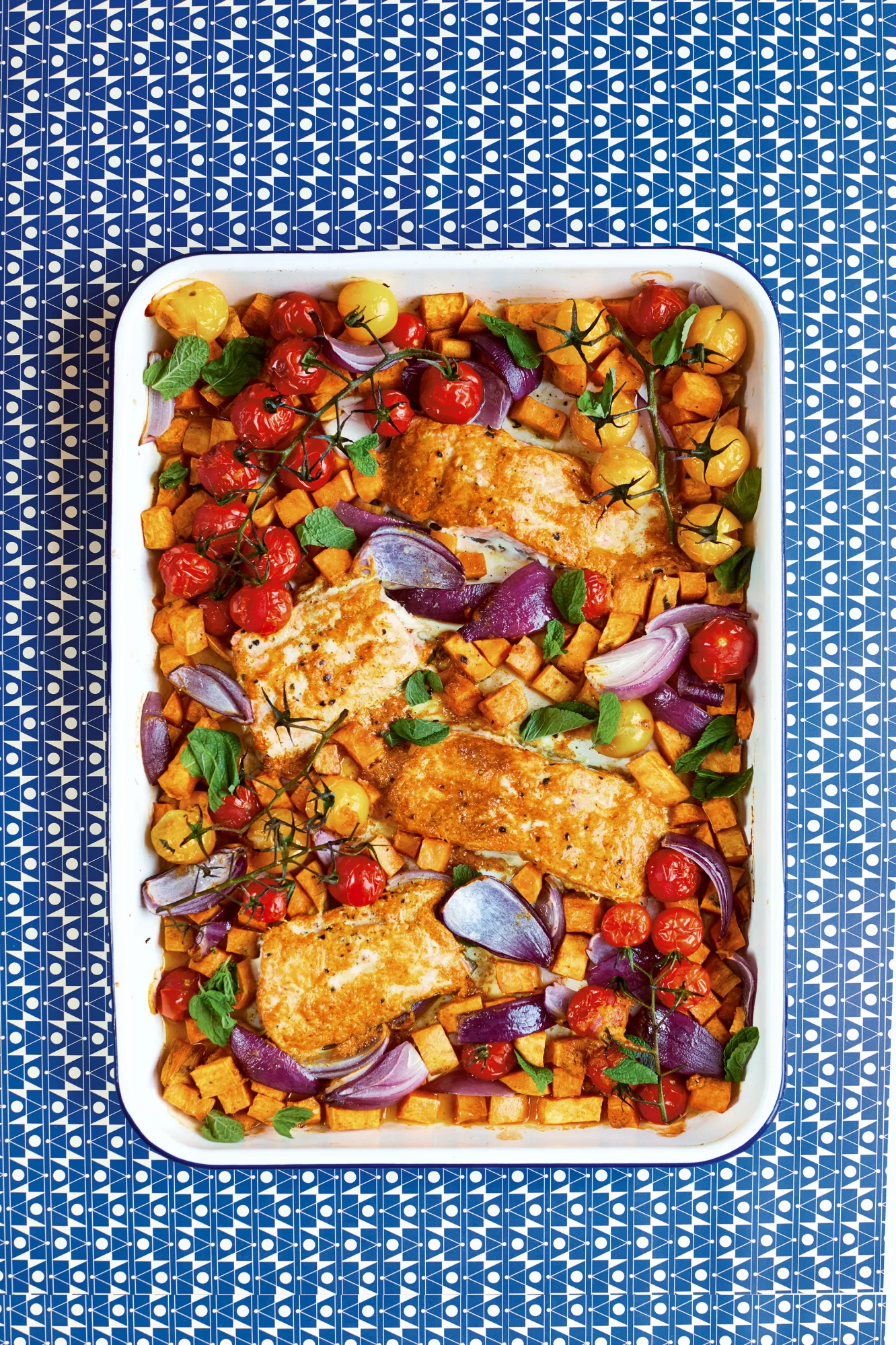 Deze zalm-tandoori met zoete aardappel, tomaten en rode ui is een heerlijk kruidig ovengerecht dat in één braadslede wordt bereid. De zalm krijgt zijn karakteristieke tandoorismaak door een frisse yoghurt-gembermarinade, terwijl de geroosterde groenten zorgen voor een zoete balans. Perfect voor doordeweeks. Voedzaam, kleurrijk en bomvol smaak.
