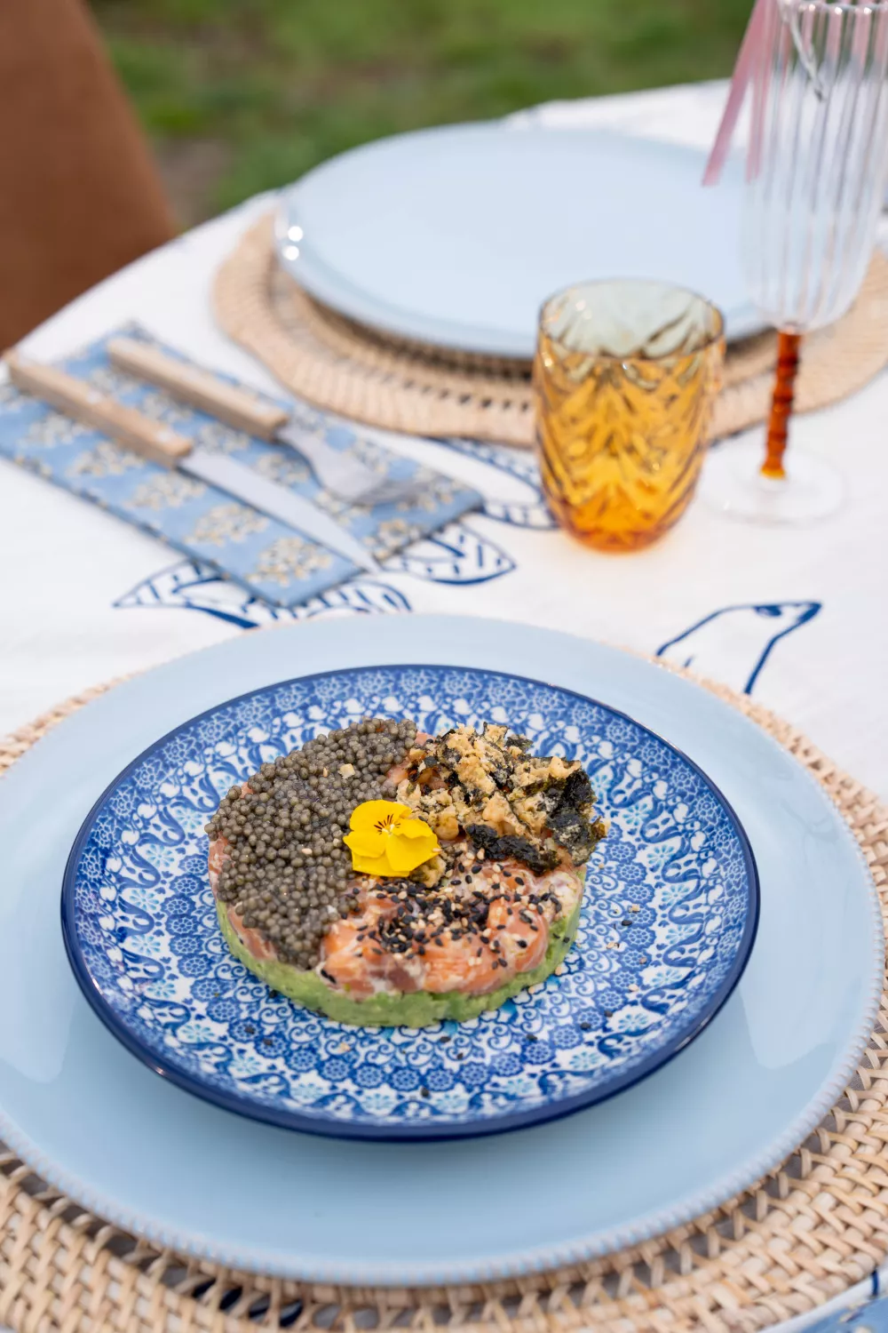 Frisse zalmtartaar met romige avocadocrème en zilte Osietra kaviaar brengt Japanse umami samen met pittige mierikswortel en verwarmende gember. Het rauwe zalmblokjesmengsel met Japanse mayonaise, sesamolie en sojasaus wordt feestelijk gevormd met een steekring en afgewerkt met krokante noricrackers en eetbare bloemetjes. Ideaal als elegant voorgerecht of zomerse amuse.