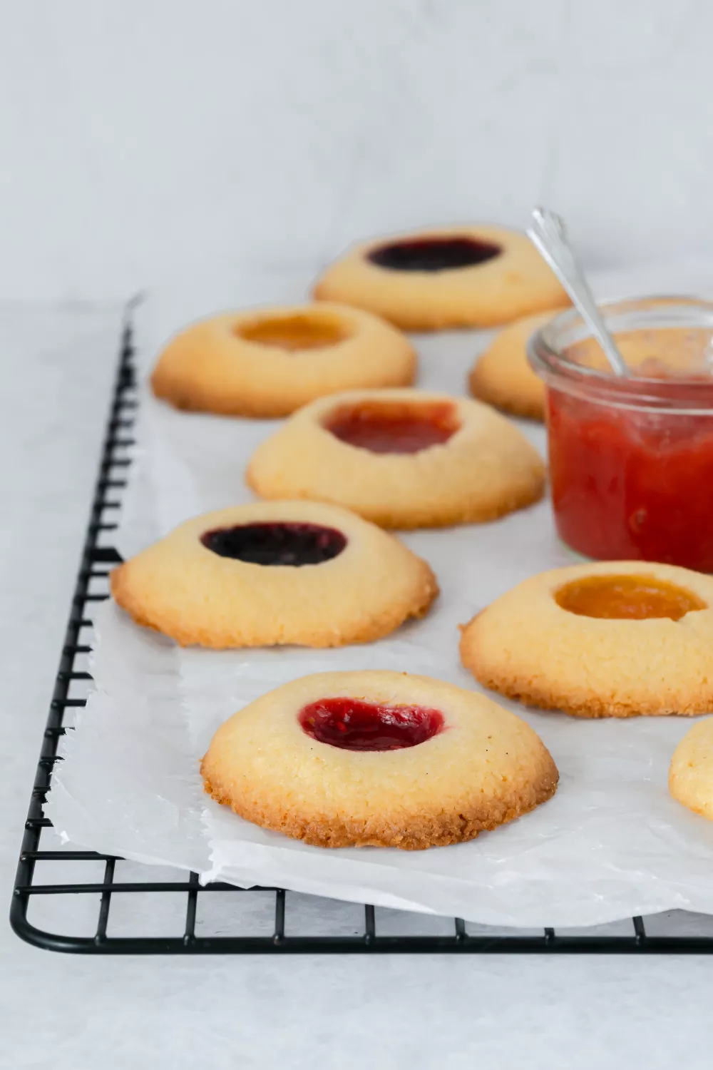 Boterzachte zandkoekjes met een fruitig confituurhart: romige roomboter, vanillesuiker en een eidooier geven het deeg een rijke, fluweelachtige textuur. Het eenvoudige bakproces van romig kloppen, kort laten rusten in de koelkast en bolletjes met een kuiltje vullen voordat je ze goudbruin bakt maakt dit recept perfect voor bij de koffie, als borrelkoekje of als zoete traktatie tijdens gezellige middagen.