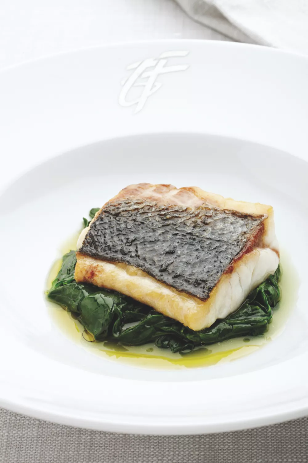 Haal de zeebaars uit de oven en verwijder de kruiden uit de buikholte. Fileer de zeebaars. Zeef de olijfolie die in de ovenschotel zit en besprenkel de vis hiermee. Serveer met de spinazie.