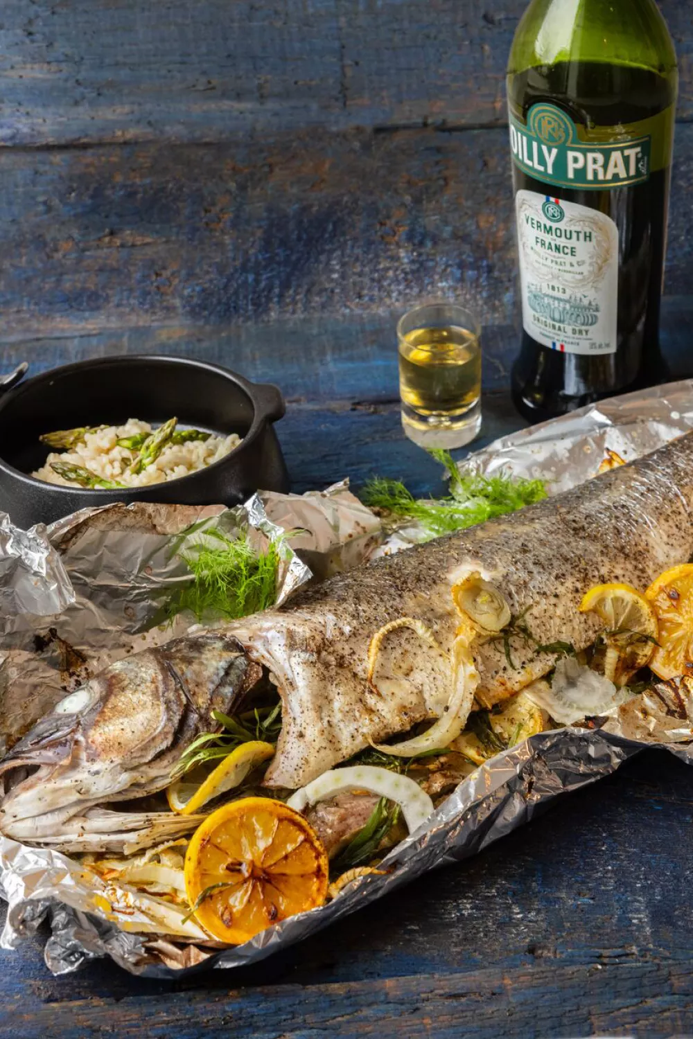 Een lichte feestelijke maaltijd van zeebaars in papillote met romige risotto van groene asperges, Parmezaanse kaas en een vleugje vermout. De vis gaart zacht in folie met venkel, citroen en dragon waardoor fijne anijs- en citrusaroma's vrijkomen, terwijl de risotto op lage temperatuur langzaam de rijke visfond en boter absorbeert. Perfect voor lente- en zomerdiners of een elegante doordeweekse maaltijd.