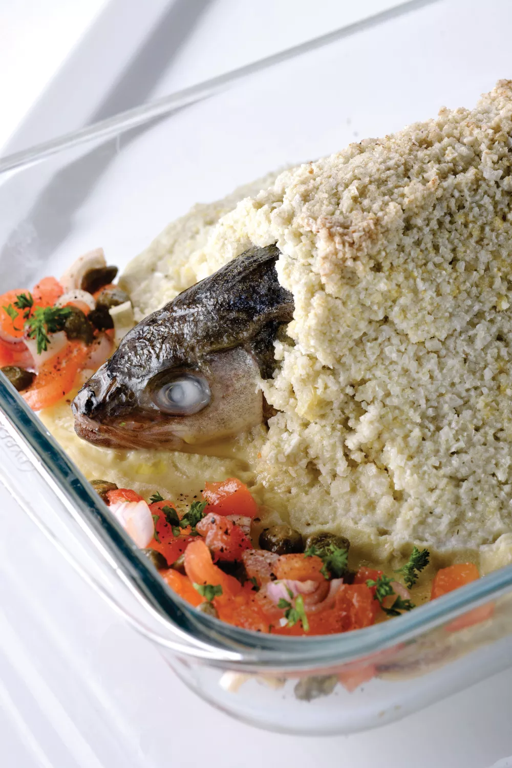 Haal de vis uit de oven. Klop met een beiteltje of een bot mes de zoutkorst aan beide lange zijden los. Breng de vis zo aan tafel. Haal daar met vork en lepel de volledige bovenzijde van de korst van de vis af en verdeel de vis over de borden. Zet de tartaar, een sauspannetje met heel goede olijfolie en de pepermolen ook op tafel.