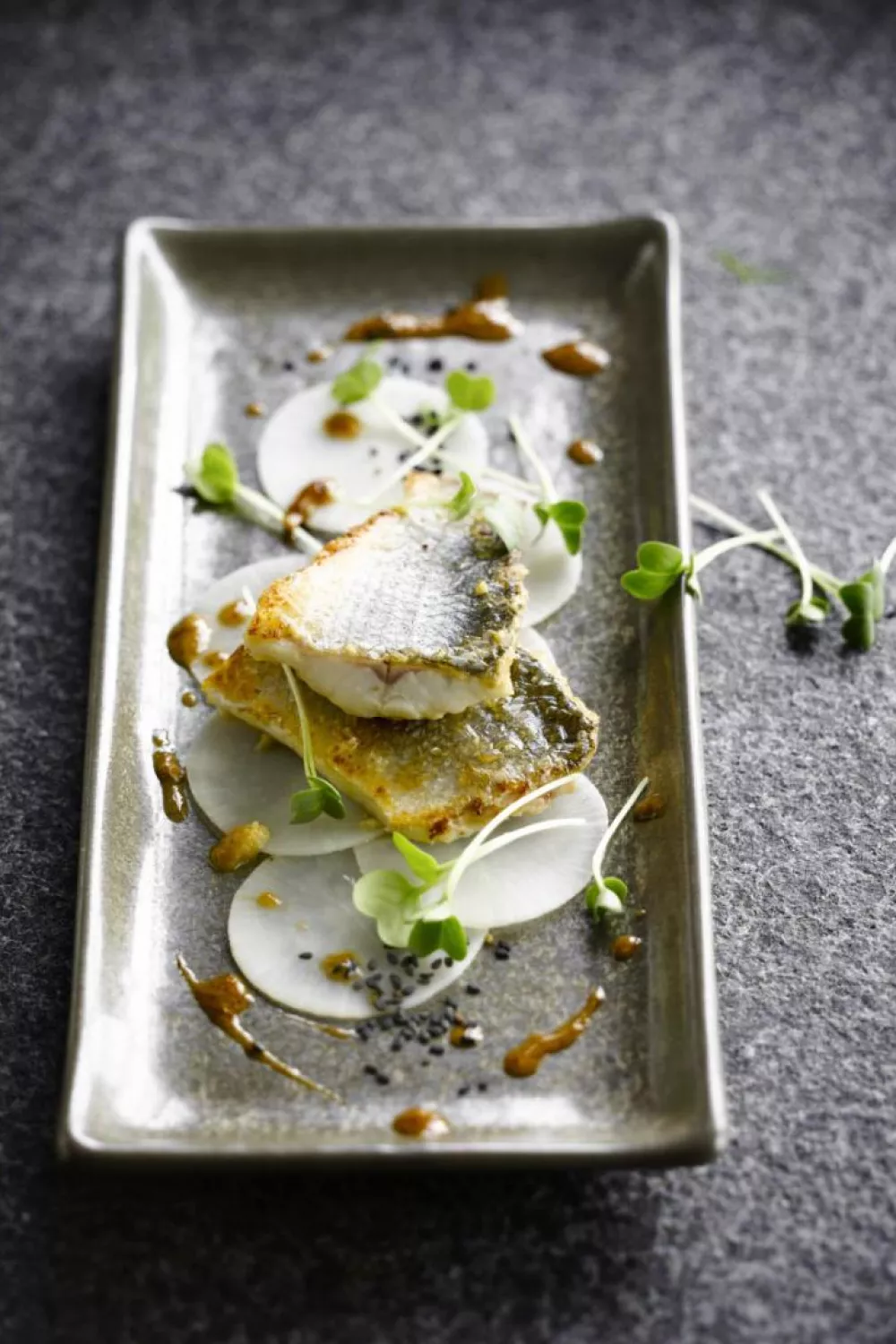 Schik de daikon in een bord en leg daarop de zeebaars. Werk af met geroosterde sesamzaadjes, misosaus en daikoncress.