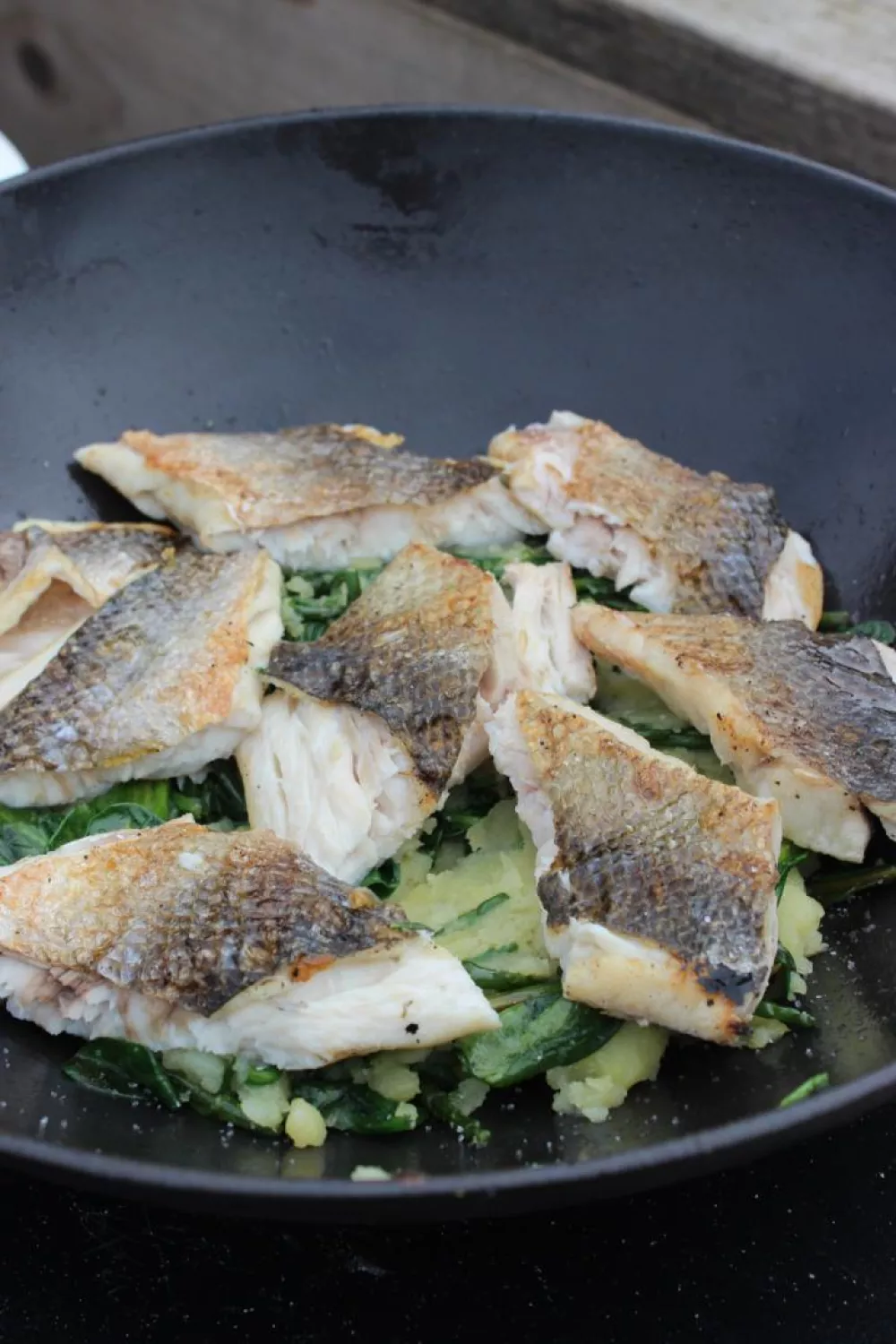 Krokante gegrilde zeebaars op een frisse salade van gepureerde aardappel en zeekraal brengt pure smaak van de zee in een lichte zomerse maaltijd. Lamsoor en babyspinazie geven textuur en kleur terwijl de vis door een dun laagje bloem op de barbecue mooi krokant wordt. Een scheut olijfolie en wat citroensap maken dit visgerecht perfect als eenvoudige barbecue of gezonde dineroptie.