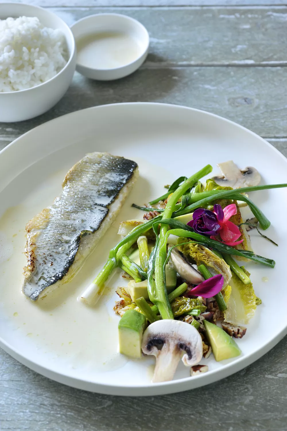 Zachte zeebaarsfilets worden geserveerd met een romige Thaise saus van kokosmelk, citroengras en limoen die frisse en exotische smaken samenbrengt. Gestoofde aromaten, een hint groene curry en krokant geroosterde pindanoten geven diepte, terwijl basmatirijst, avocado en knapperige sucrinesla textuur toevoegen. Een verfijnd maar toegankelijk gerecht dat zich perfect leent voor een zomers diner of speciale weekavond en waarin sauteren, blenden en een korte ovenfinish de smaken versterken.