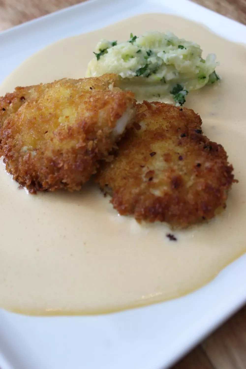 Zeeduivel-schnitzel met kruidenpuree en dijonaise