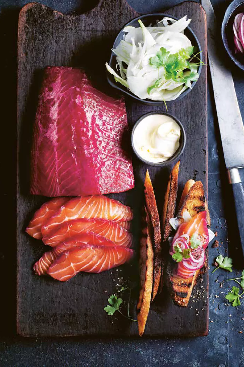 Zachte, licht gezouten zeeforel krijgt frisse kleur en aardse zoetheid van een knapperige bietenzoutkorst met dille. Dun gesneden plakjes op knapperige zuurdesembaguette met mierikswortelcrème, venkel en ingelegde rode ui vormen een feestelijk voorgerecht of verfijnd borrelhapje. De korte pekeltechniek van vier uur maakt dit lente en zomergerecht snel en stijlvol klaar.