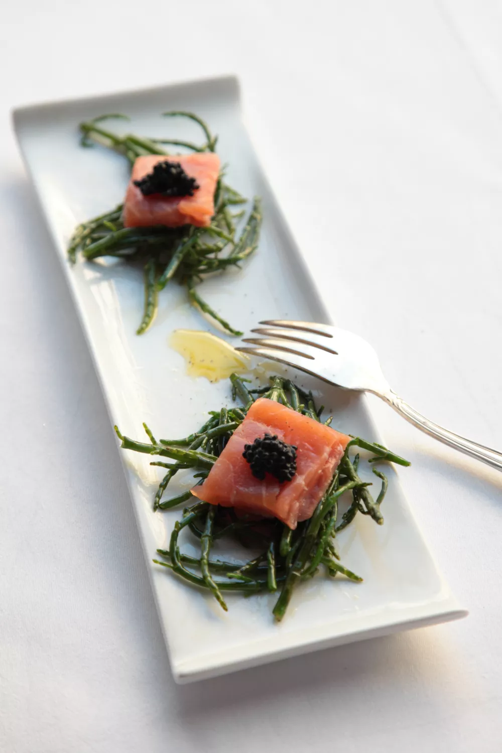 Fris en elegant hapje met zeekraal en gerookt zalmhaasje, ideaal als voorgerecht of feestelijk aperitief in lente en zomer. De zeekraal wordt kort gewokt in olijfolie en krijgt gezelschap van zacht in de oven opgewarmde zalm en parels van zwarte viseitjes. Snel klaar, zilt en verfijnd met alleen wat zwarte peper.