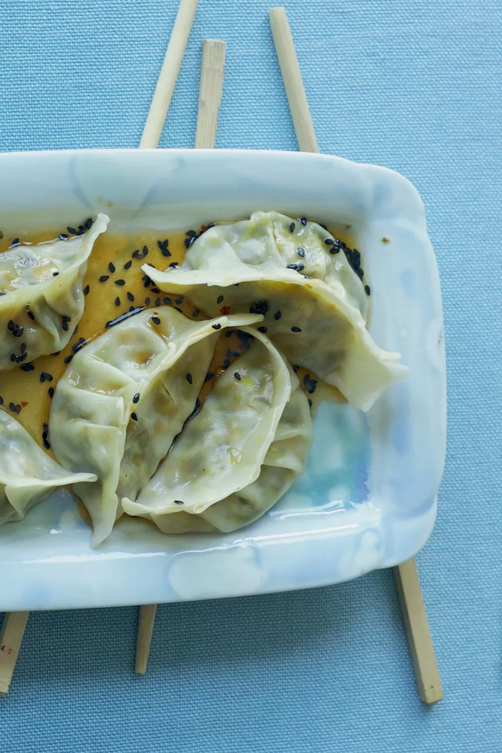 Frisse Aziatische gyoza's met gyozavelletjes, zeespaghetti, shiitake en knapperige paksoi, gevuld met roergebakken groenten op smaak gebracht met gember, mirin en sojasaus. De combinatie van zeewier, sojascheuten en kurkuma levert een diepe umami en een licht pittige toets. Perfect als origineel voorgerecht bij een zomerborrel of als snelle doordeweekse maaltijd.