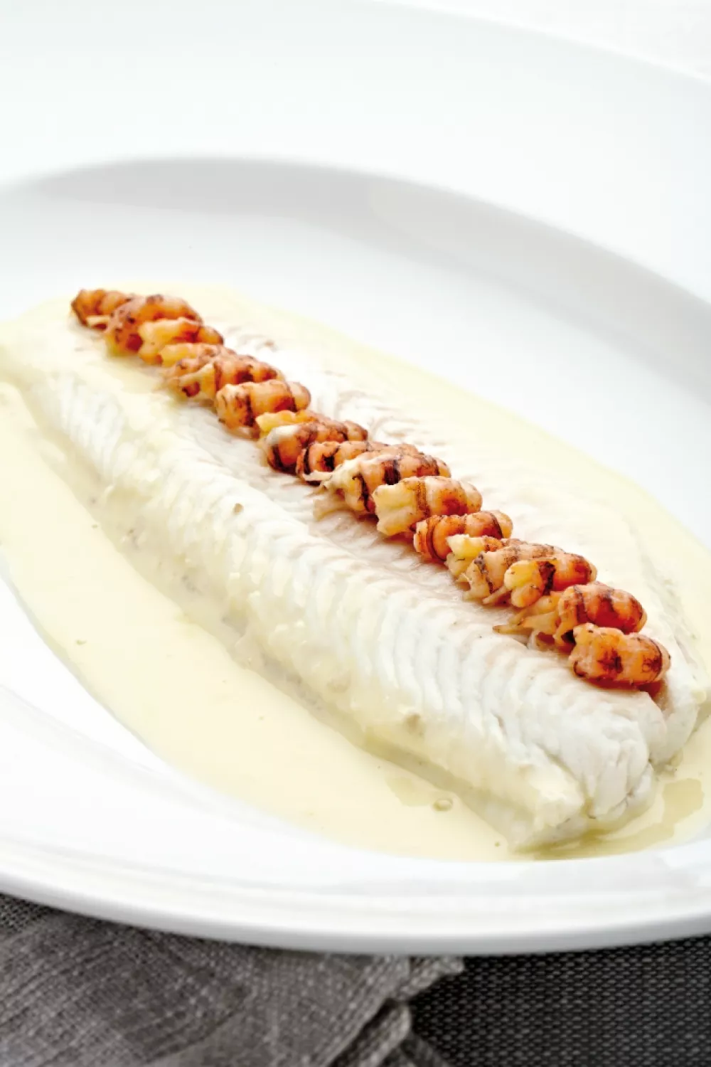 Verwijder met een mesje de kleine graatjes van de tong. Leg op een warm bord. Giet een beetje saus over de vis en werk af met verse Noordzee garnaaltjes.