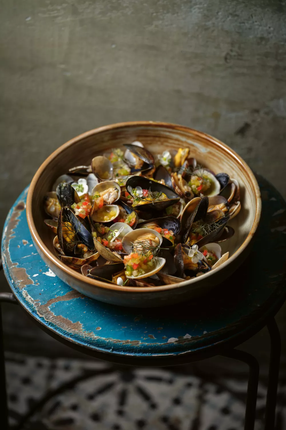 Zeeuwse schelpjes met fregola sarda, citroengras en chilipeper is een lichte, zomerse zeevruchtenschotel vol frisse citrussmaak en milde pit. Met een scheut witte wijn en extra vierge olijfolie worden de schelpjes kort aangegaard en wordt de al dente gekookte fregola overgoten met een aromatische citroengras en chilidressing, afgewerkt met verse kruiden en eetbare bloemen. Perfect als informele dinerhap of feestelijk borrelgerecht.