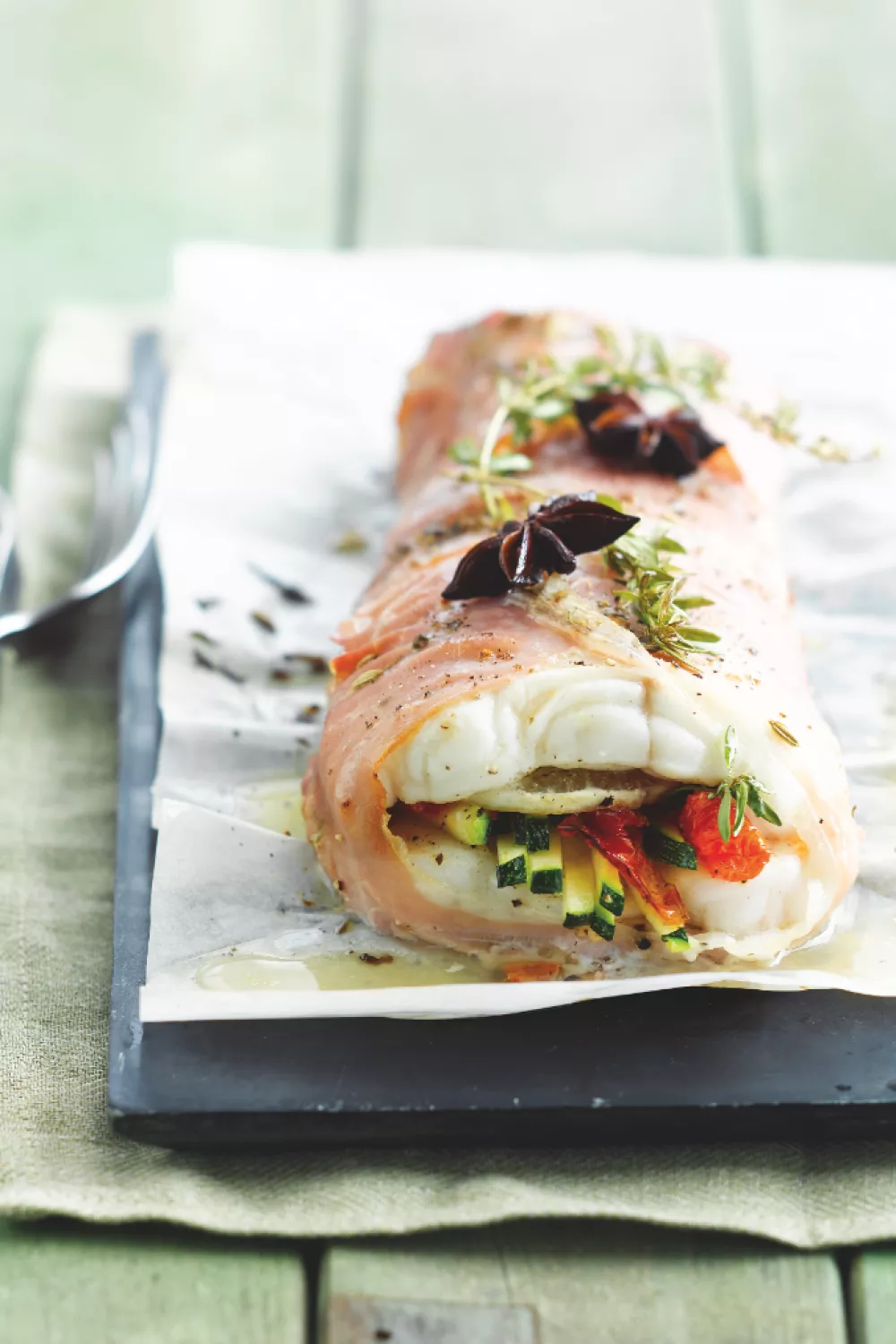 Deze ovengebakken zeewolfroulade combineert malse visfilets met zoute gedroogde ham, frisse citroen en zoete zongedroogde tomaten voor een verfijnde, feestelijke visschotel. Courgette en tijm geven een lichte, zomerse touch terwijl steranijs en anijszaad een subtiele anijssmaak toevoegen. Perfect als elegant diner of lichte lunch, eenvoudig te rollen en kort te bakken.