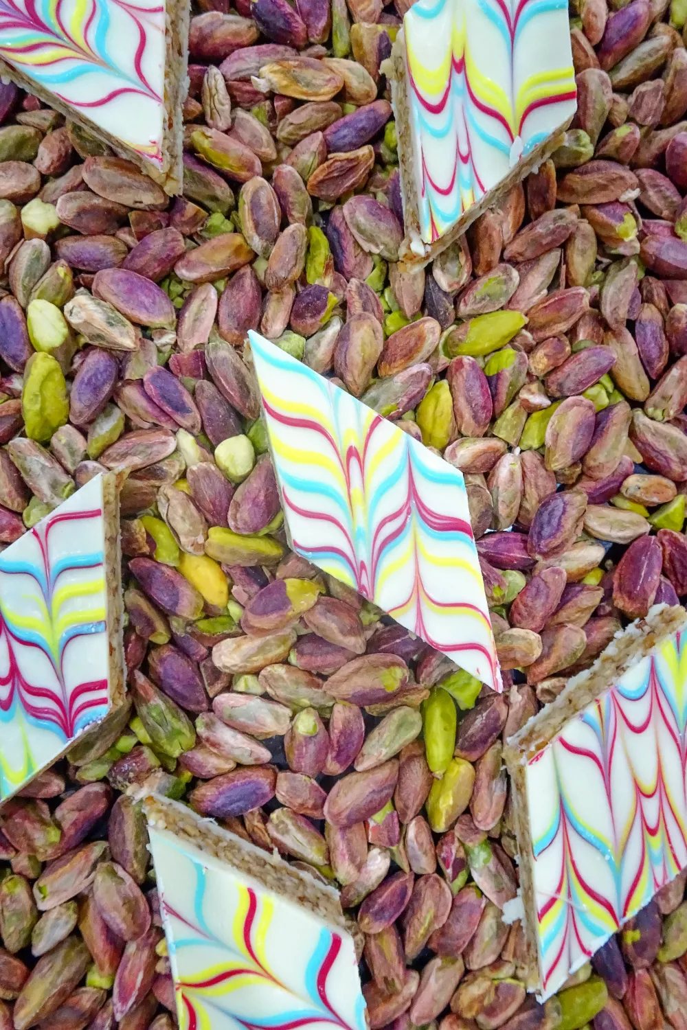 Deze Marokkaanse zelija marmerkoekjes combineren knapperige pecannoten, amandelen, hazelnoten en pistachenootjes met florale acaciahoning en zijdeachtige witte chocolade. Geroosterde en fijngehakte noten worden samengebracht tot een licht plakkerige massa, waarna getempereerde chocolade voor een glanzend marmerpatroon en kleurrijke accenten zorgt. Heerlijk bij een kopje thee of als feestelijk borrelhapje, ideaal voor ambachtelijke patisserie en seizoensgebonden lekkernijen.