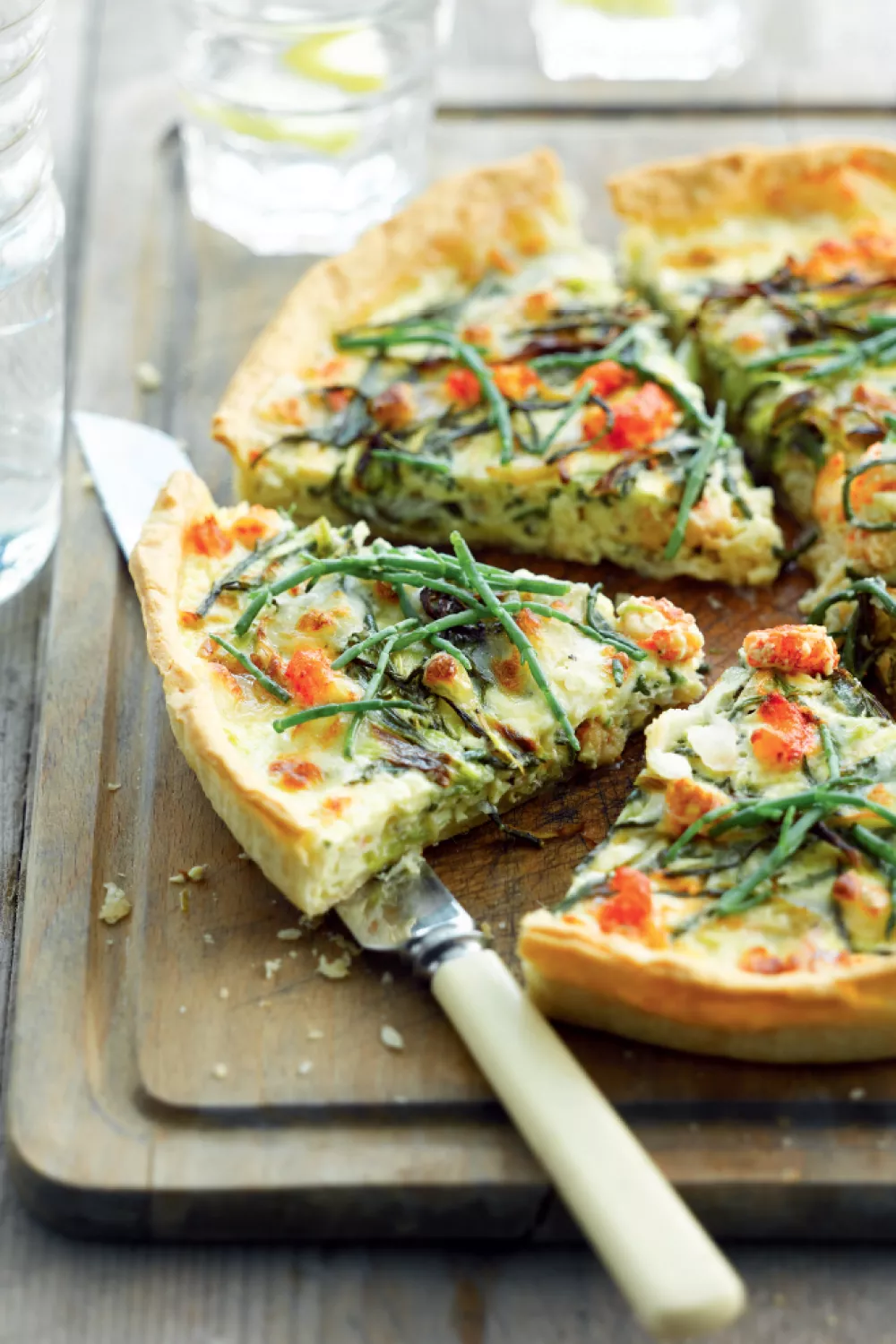 Zilte quiche met zeekraal en gerookte heilbot brengt de frisse smaak van de Noordzee naar je tafel, met krokant kruimeldeeg en romige sojaroom. Gestoofde prei en rivierkreeftjes geven elke hap diepgang, ideaal als zomerse lunch, brunch of borrelhap. Door de bodem voor te bakken en alles in de oven af te bakken krijg je een goudbruine, stevige vulling.