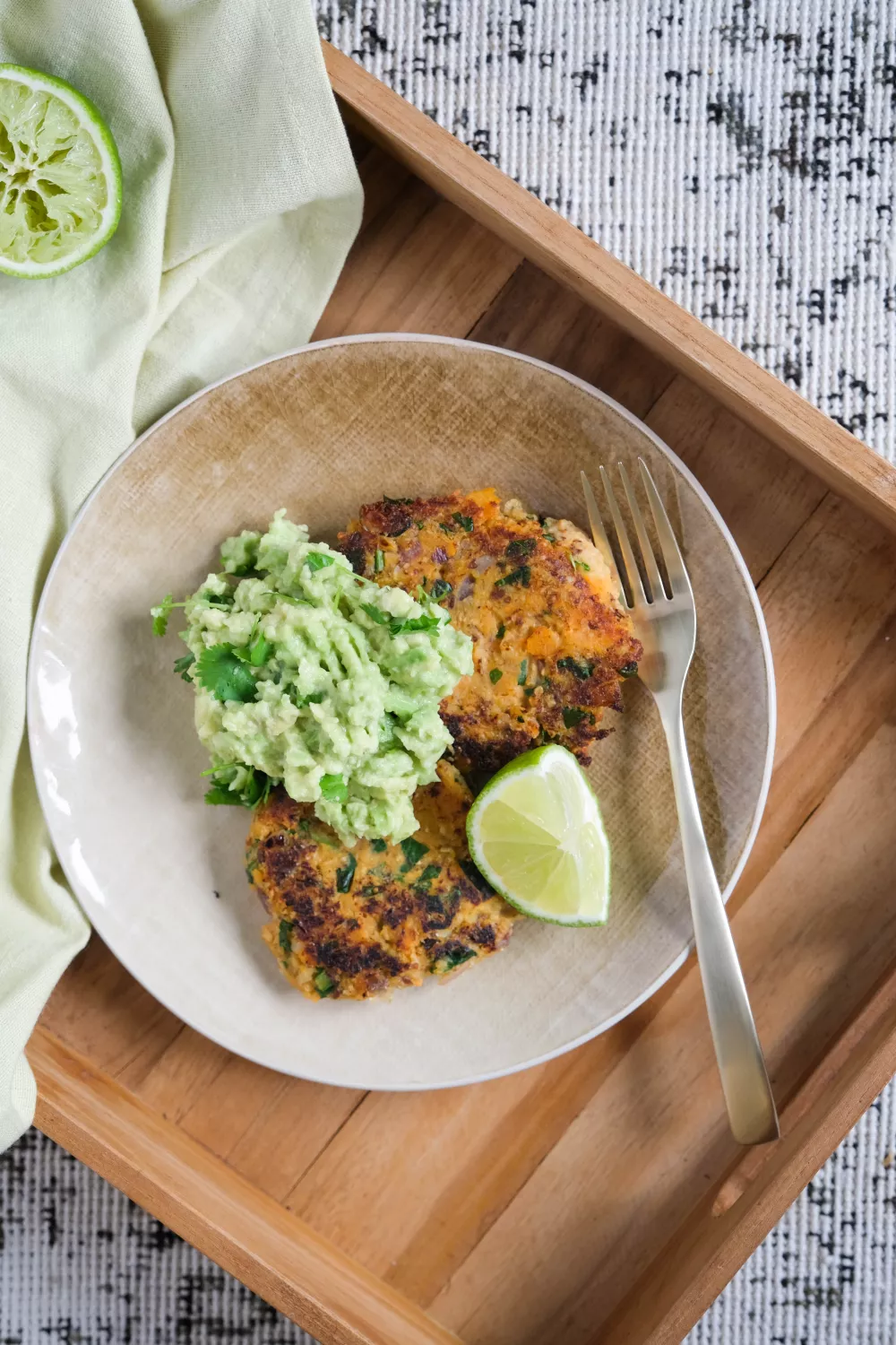 Deze voedzame zoete aardappelburgers met romige avocado en witte bonen zijn ideaal voor een snelle vegetarische lunch of een zomerse barbecue. Door zoete aardappel en bonen te stampen en kort te mengen in de keukenrobot krijg je stevige burgers die in kokosolie goudbruin bakken. Met spinazie, havermeel, komijn en een frisse avocadopuree met limoensap en koriander proef je hartige en frisse smaken in elk hapje.