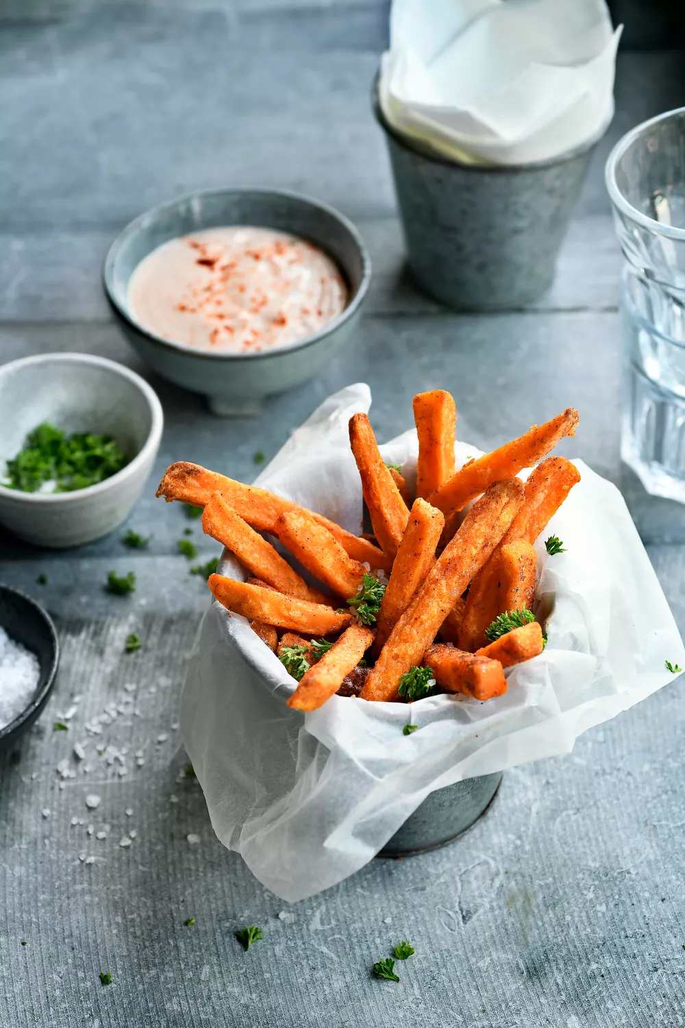 Knapperige ovengebakken zoete aardappelfrietjes met gerookte paprikapoeder en een romige chipotle mayonaise op basis van Griekse yoghurt. Een kleurrijk en licht bijgerecht of gezellige borrelsnack voor lente en herfst, waarbij maïszetmeel zorgt voor extra krokantheid en de grill een goudbruine finish geeft. Serveer warm met een scheut limoen en verse peterselie voor een frisse toets.